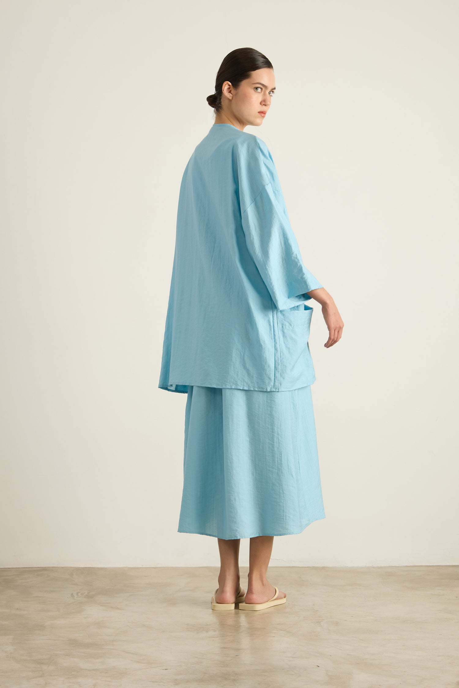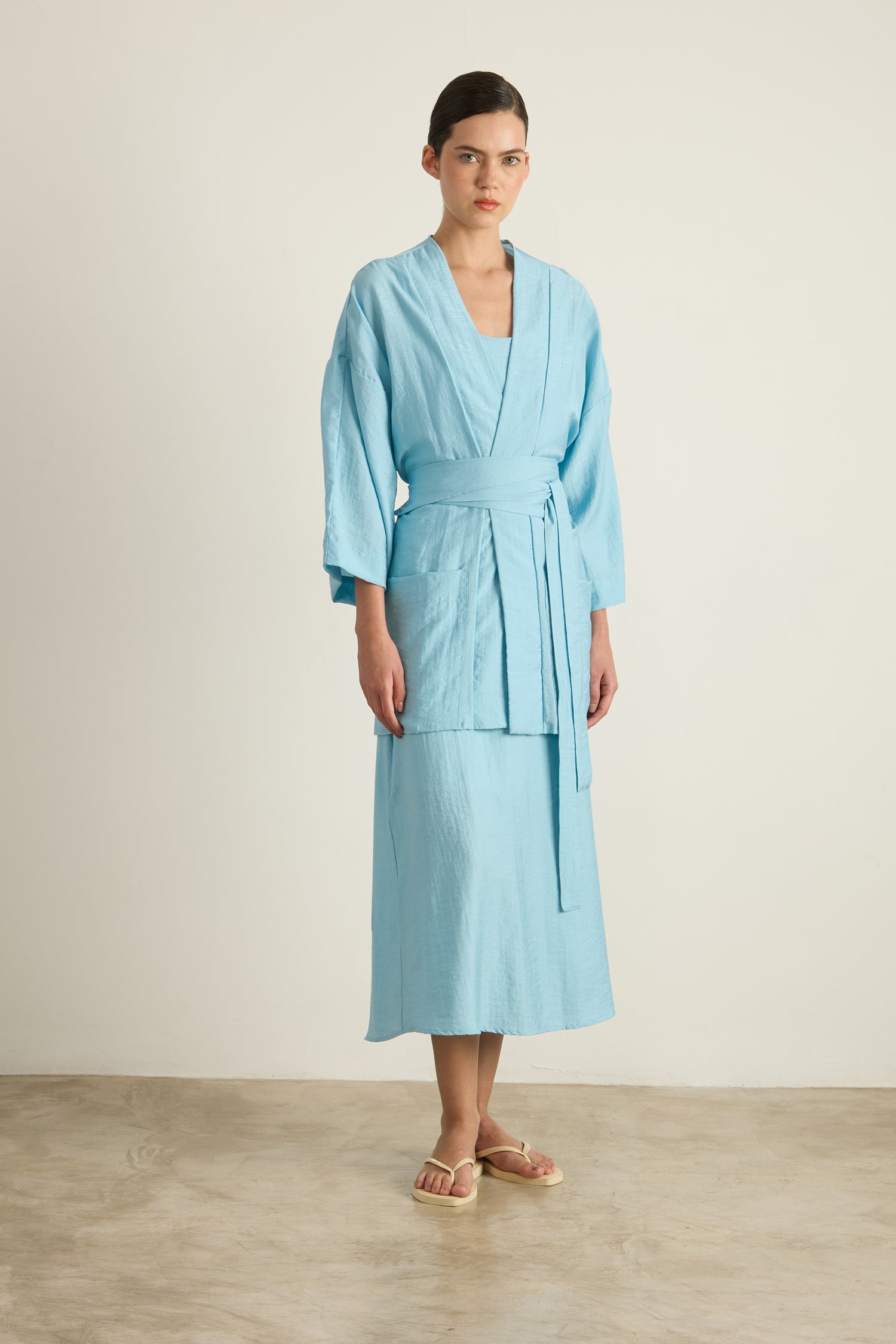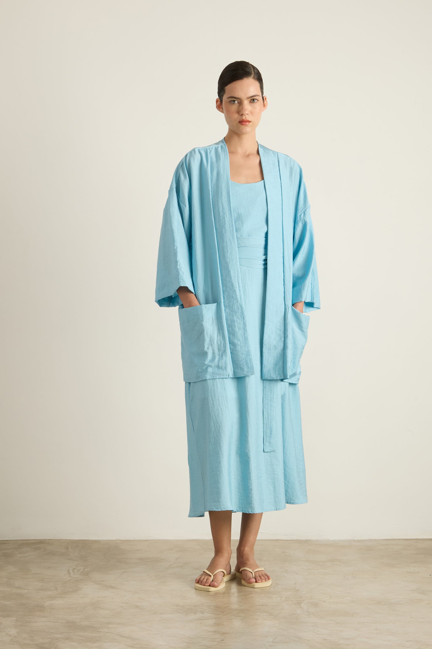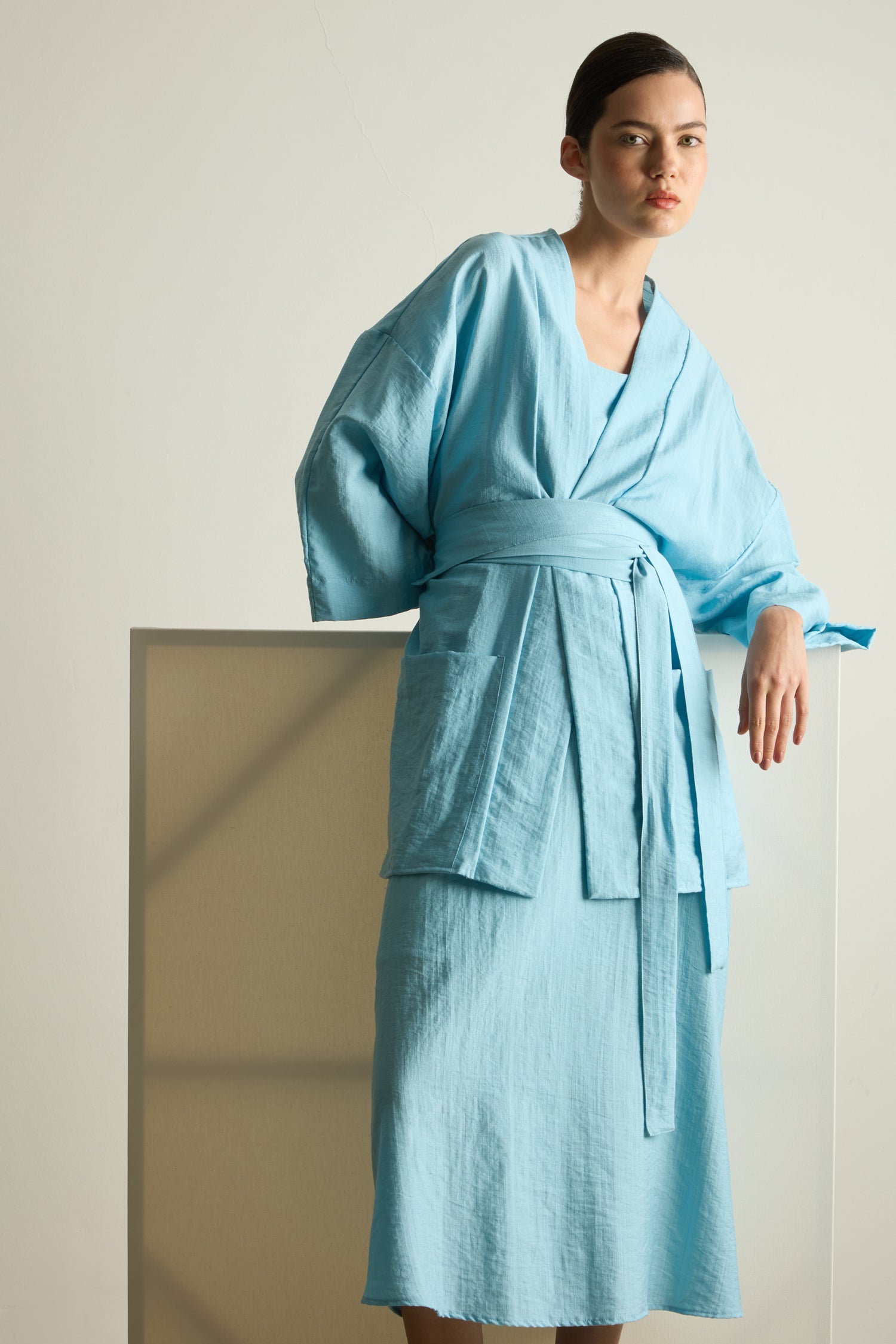 Sobre o modelo: Kimono simples com bolsos chapados. A modelagem foi projetada para gerar um vestido de caimento soltinho e fresco, mas ainda com um visual rico. Eleva qualquer look, adicionando uma nova camada de sofisticação com frescor e leveza. Lindo, confortável, fresquinho: perfeito!