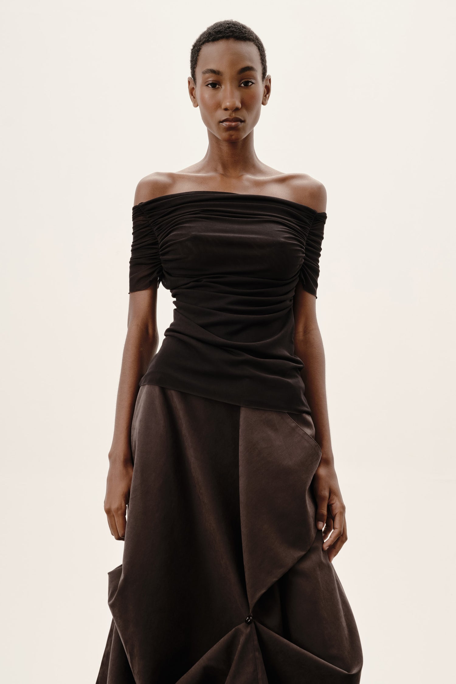 • Blusa ombro a ombro com franzidos e elástico embutido nos ombros