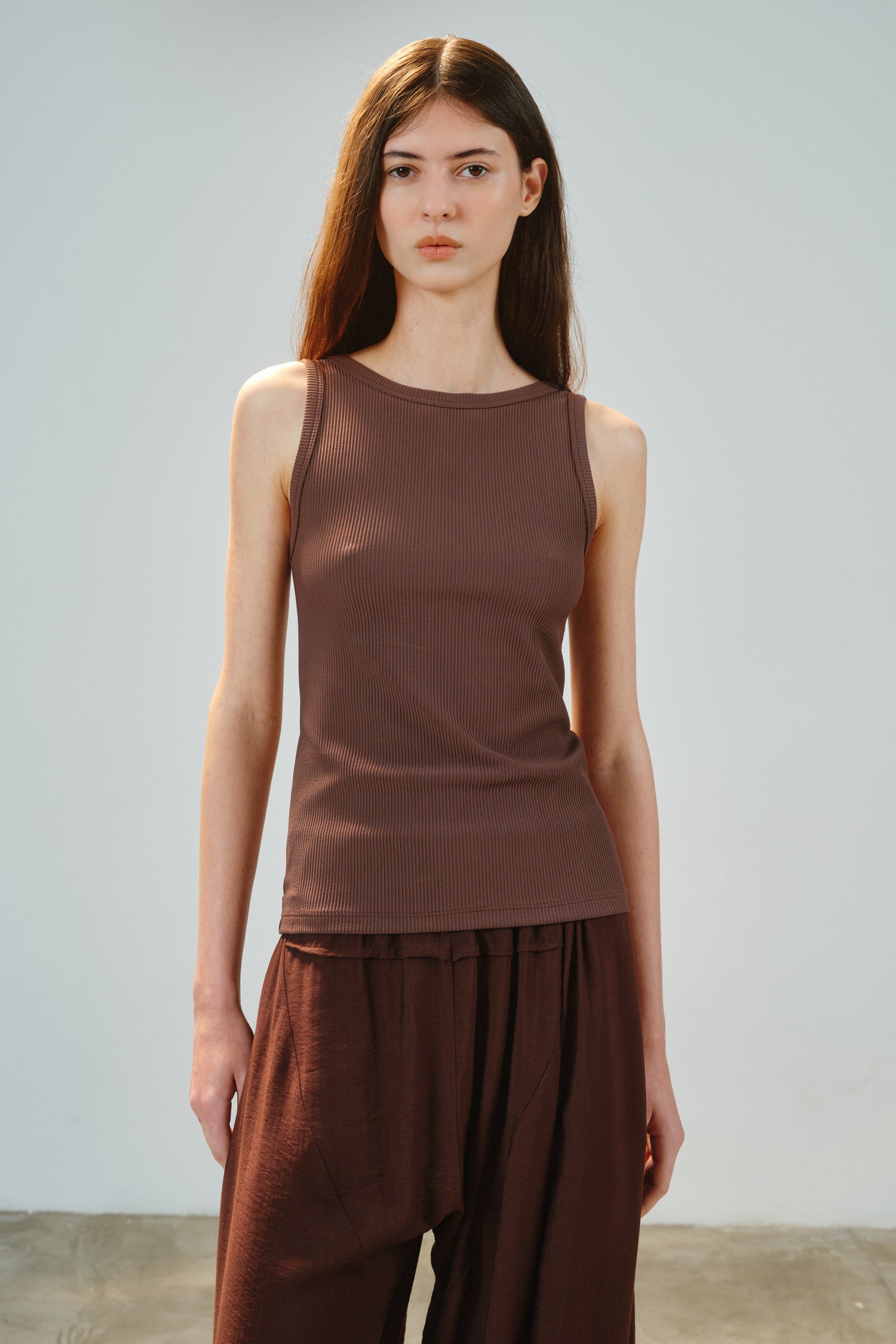 • Confeccionada em malha dupla, mais espessa, que reduz não marca o corpo e suaviza texturas. Uma peça essencial elevada, que vai além da regata tradicional em ribana ou canelado.