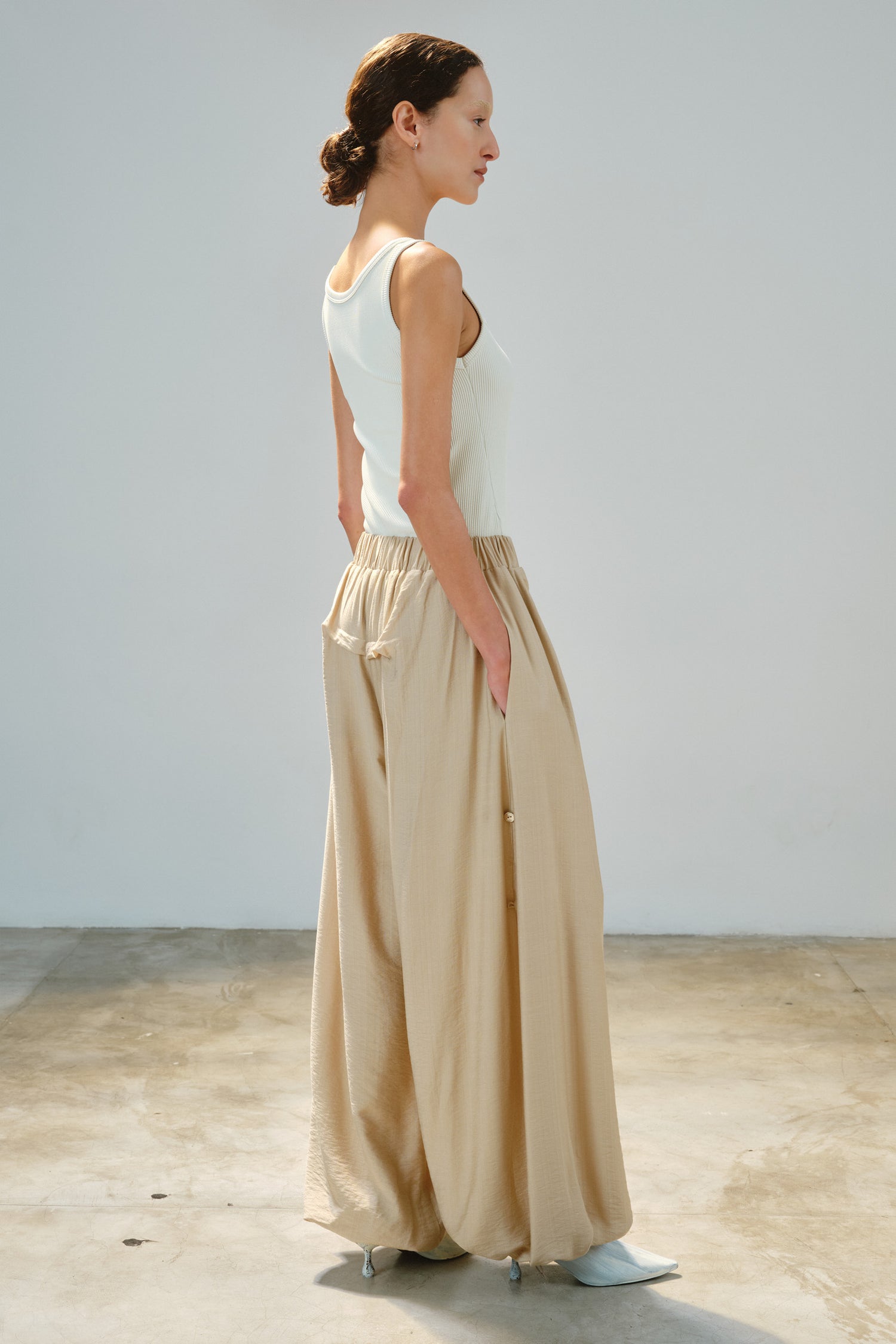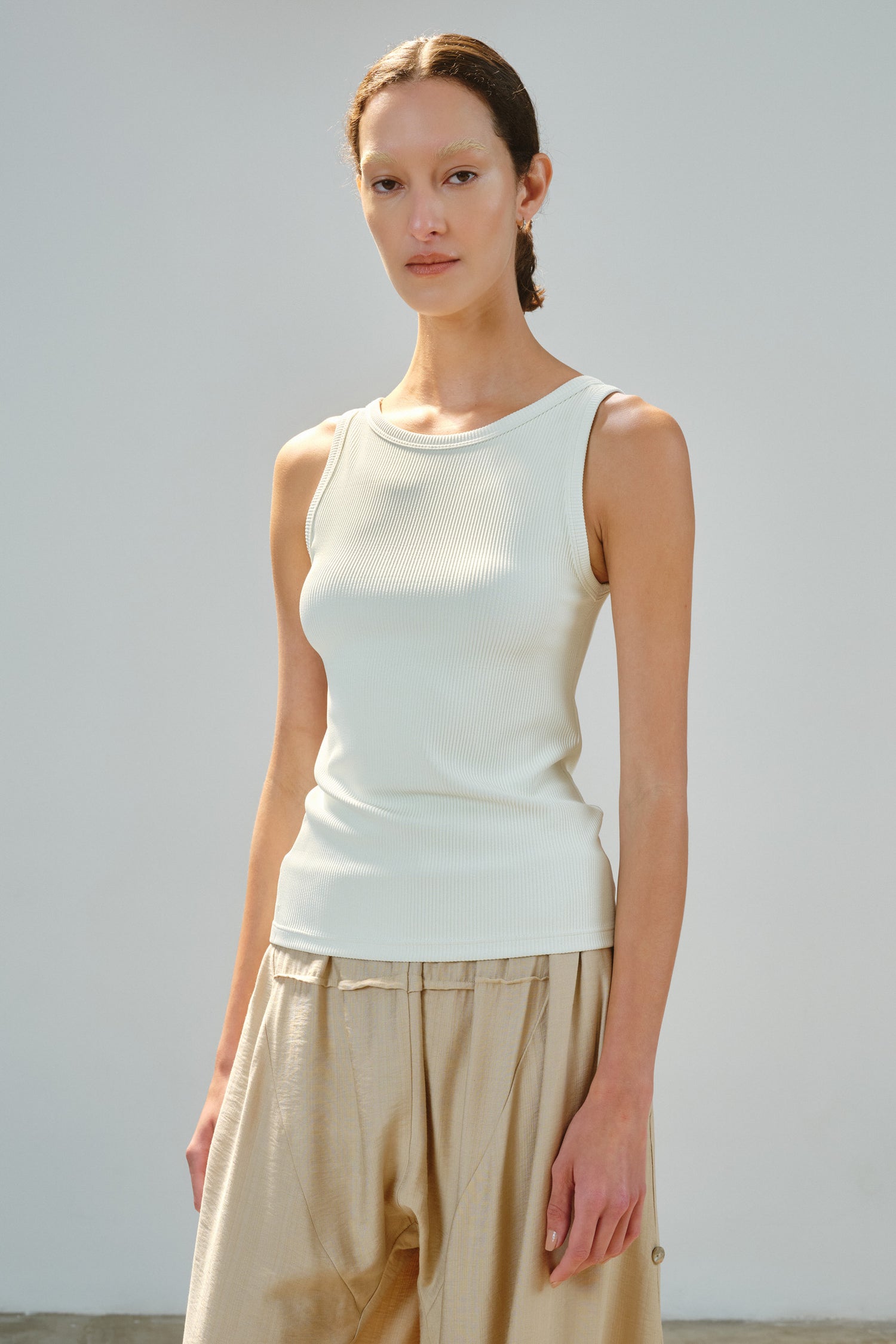 • Confeccionada em malha dupla, mais espessa, que reduz não marca o corpo e suaviza texturas. Uma peça essencial elevada, que vai além da regata tradicional em ribana ou canelado.