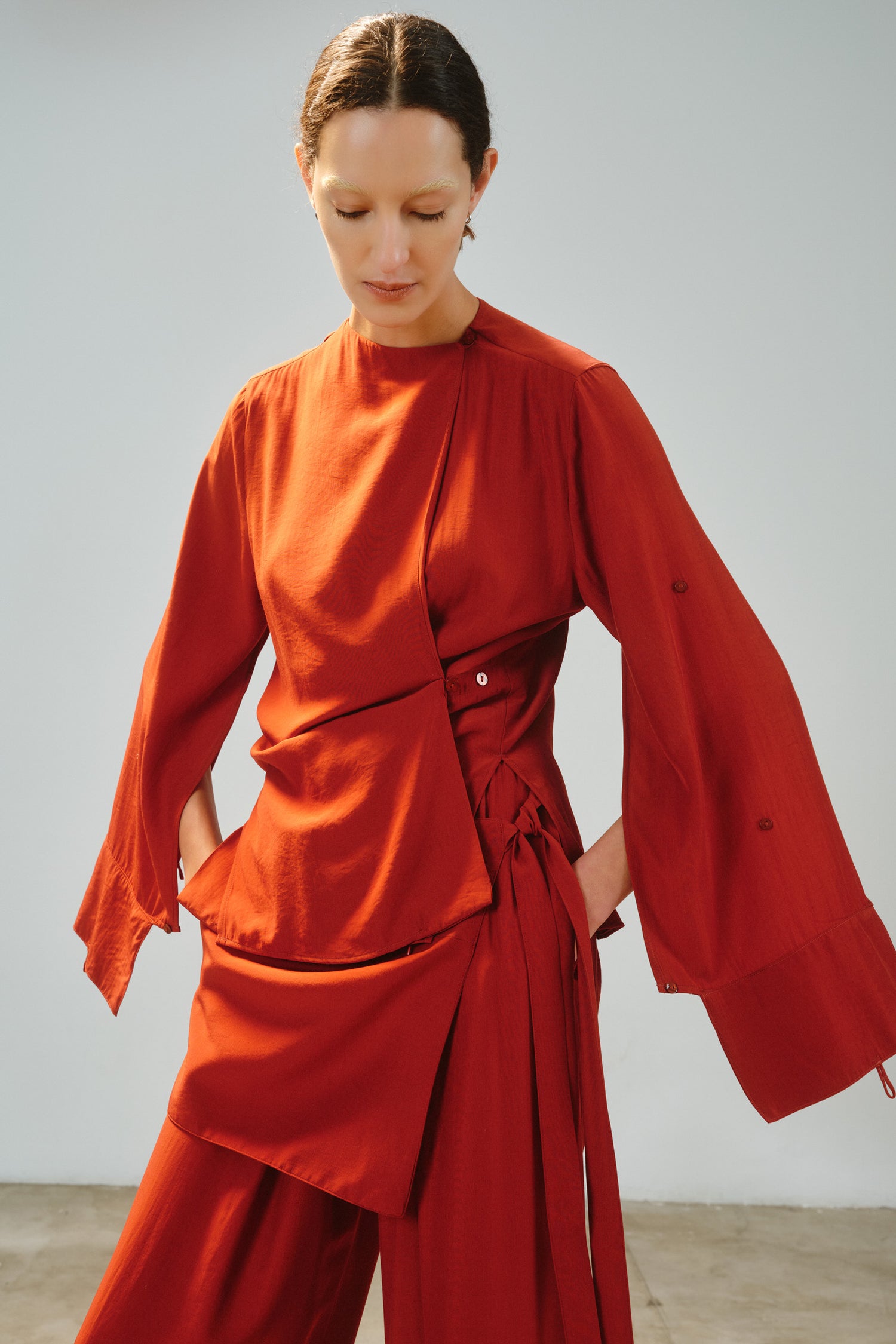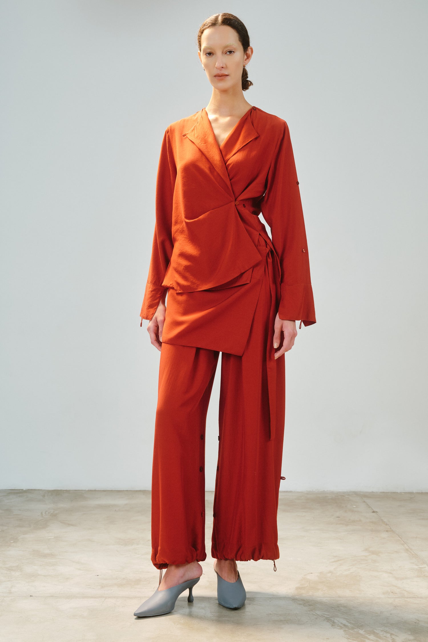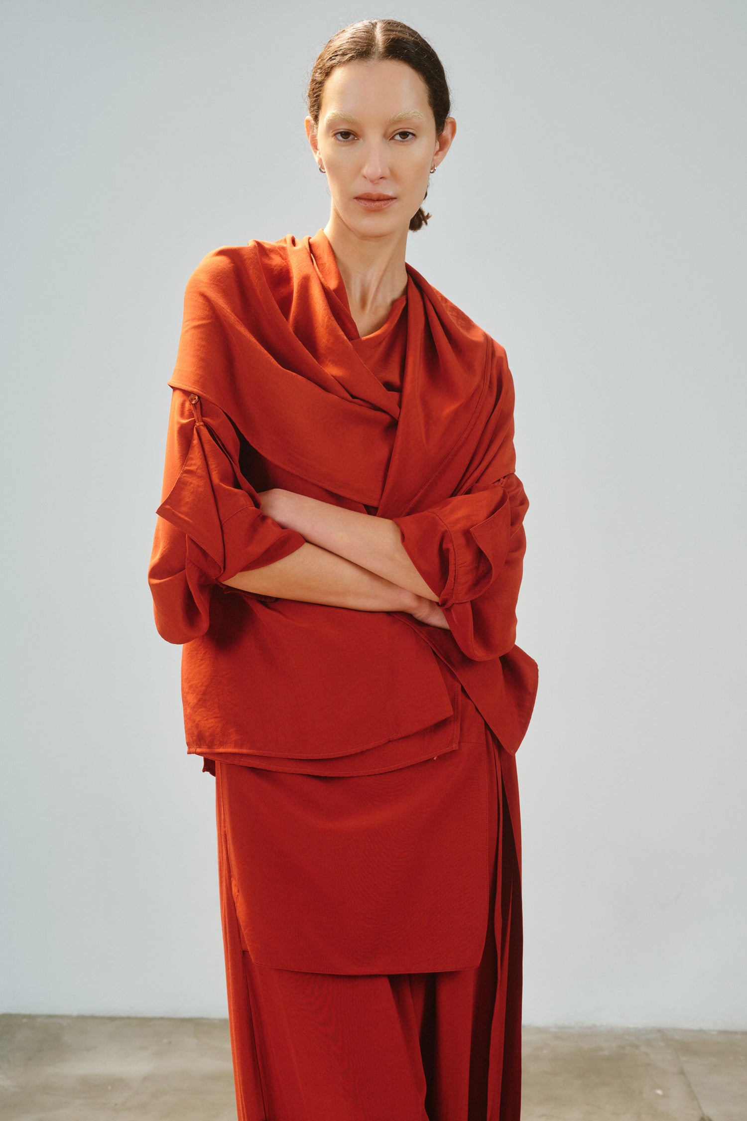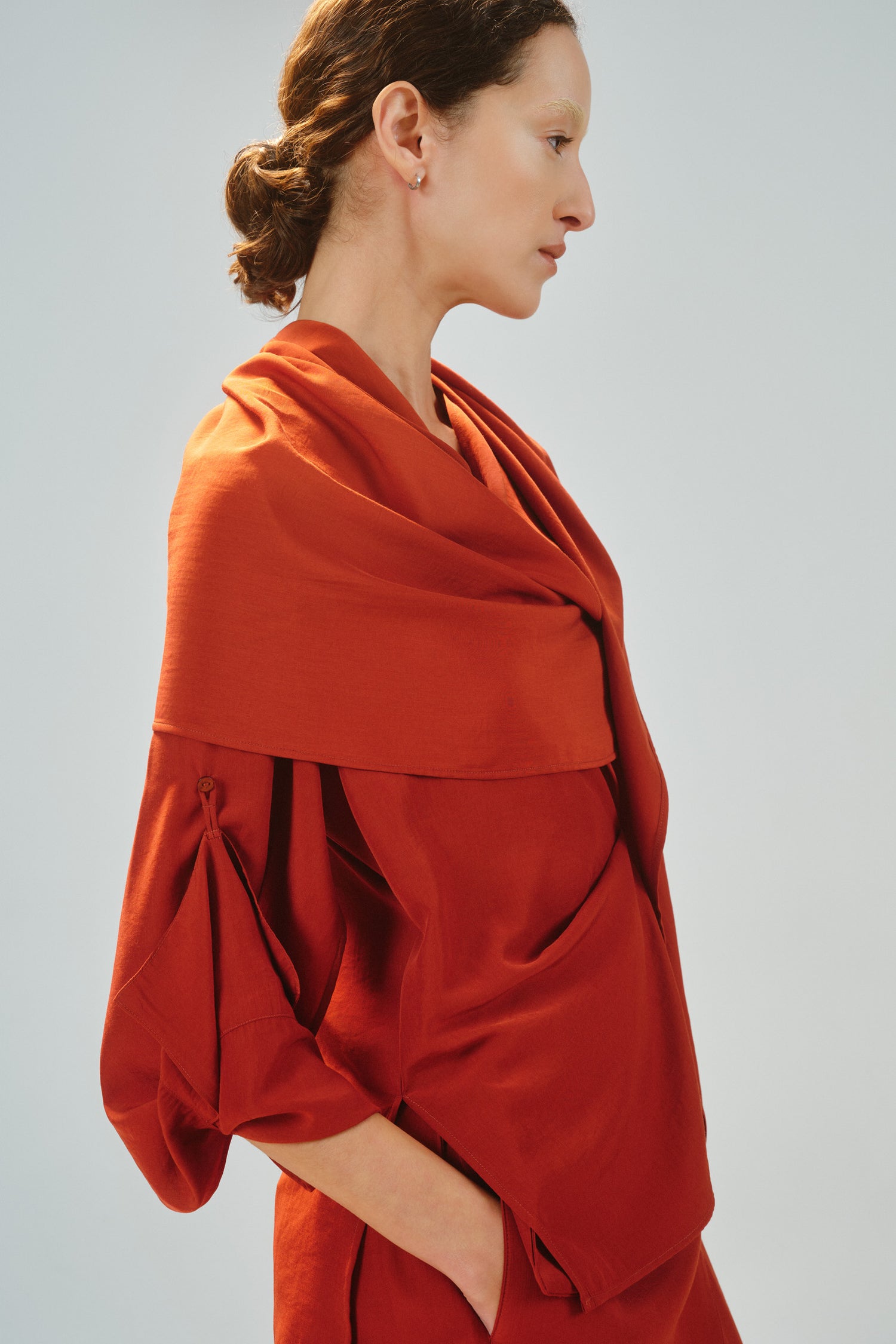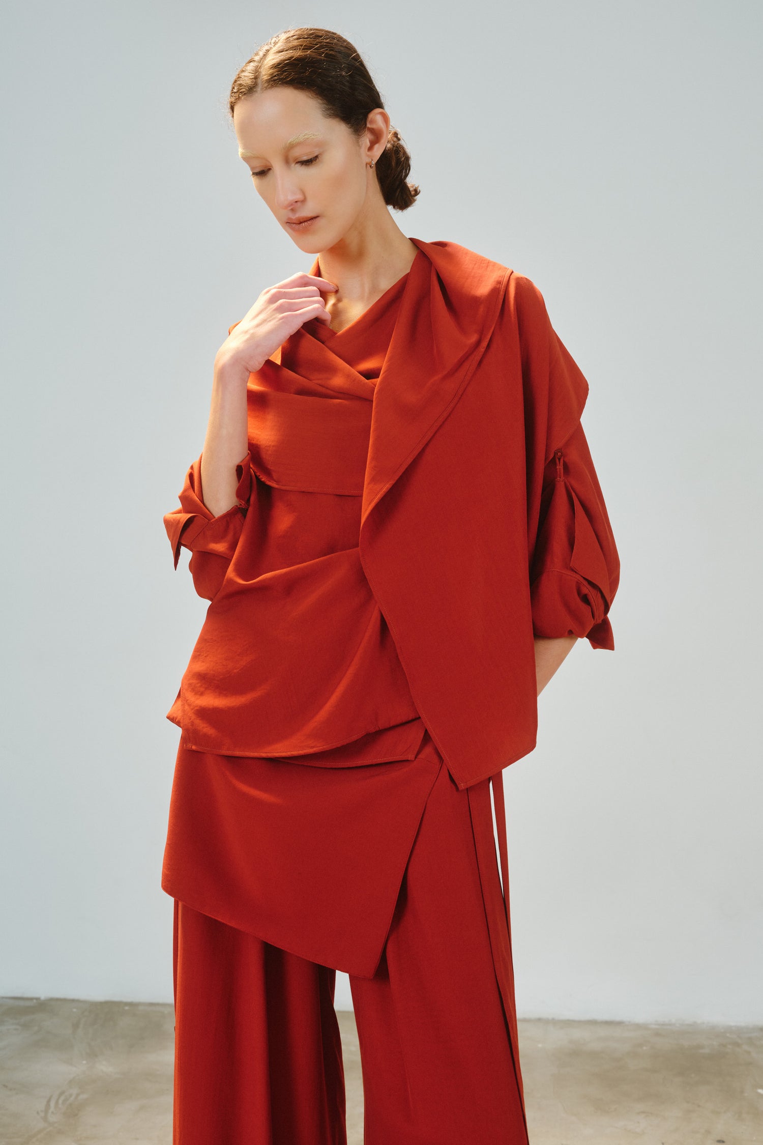 • Camisa modular em tecido de toque acetinado, com proposta versátil e autoral.