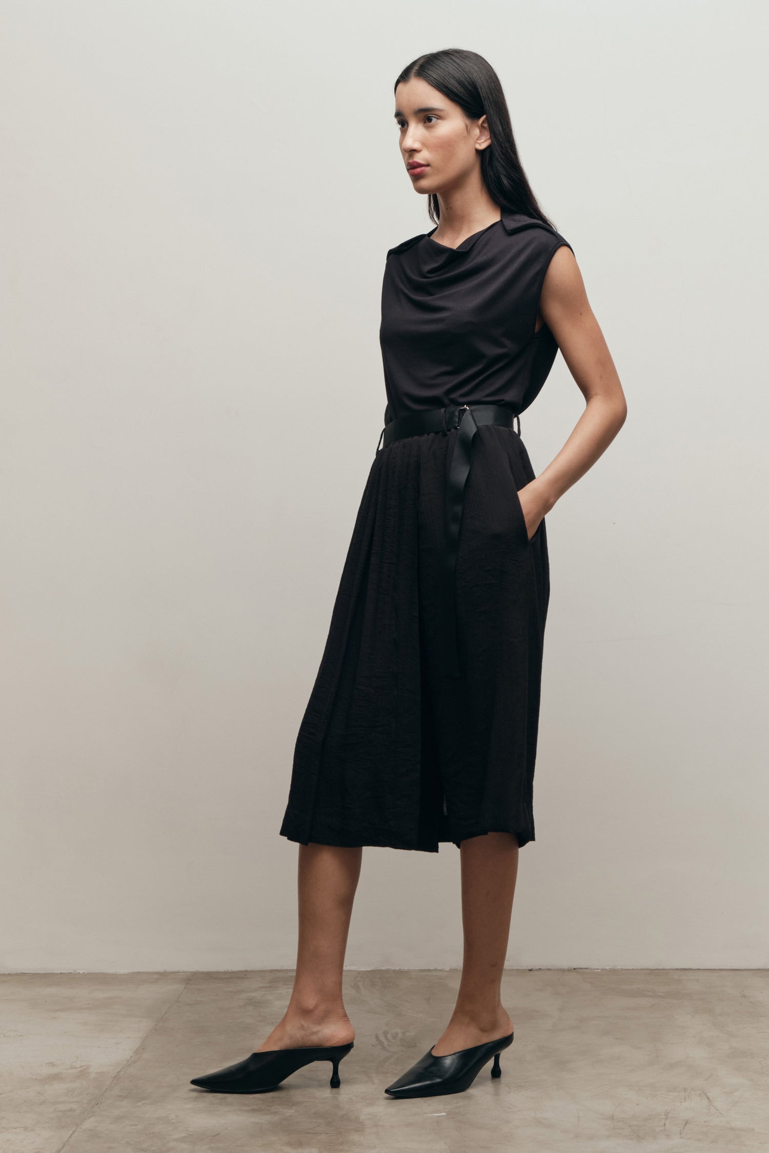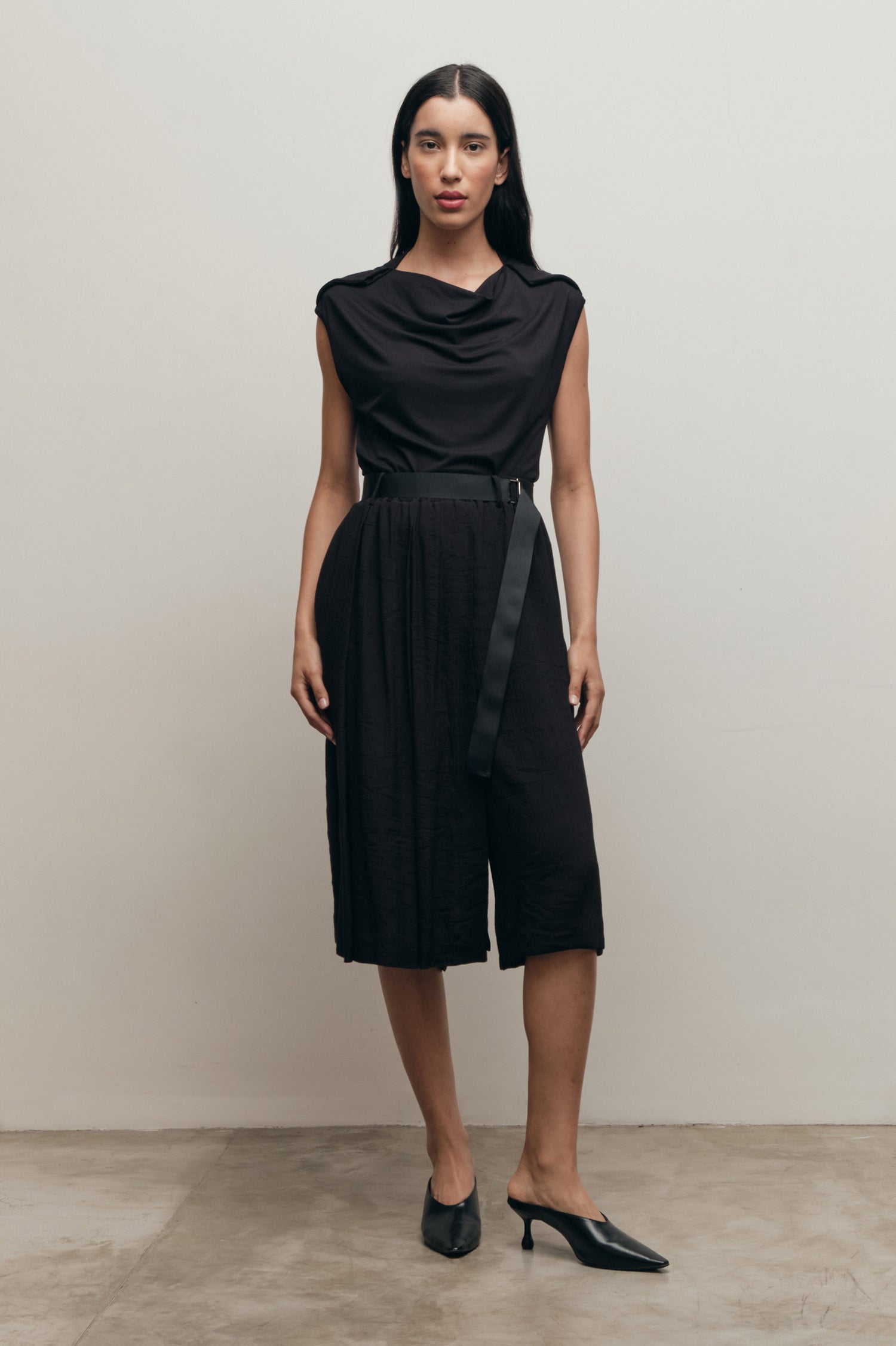 • Bermuda com sobreposição de saia, criando efeito visual sofisticado e moderno
