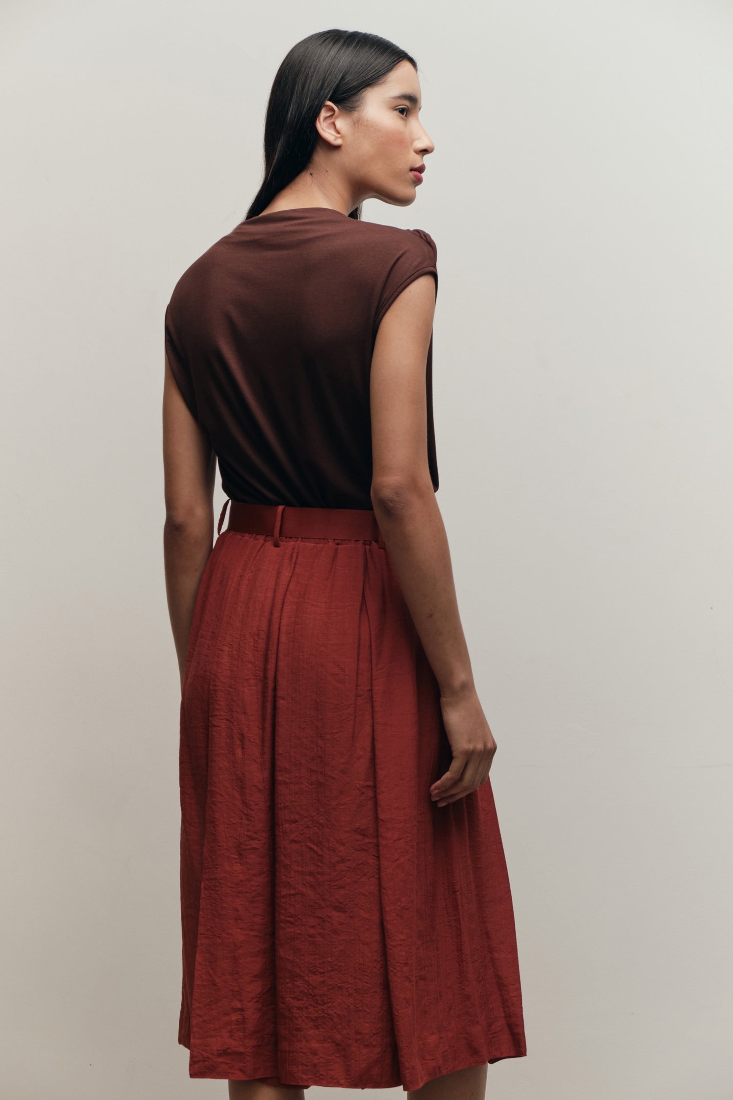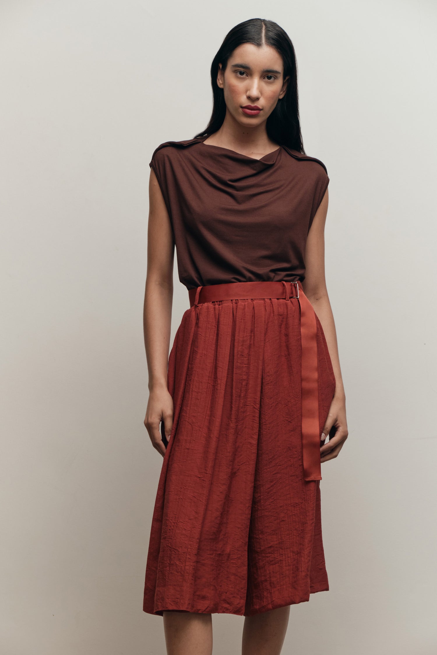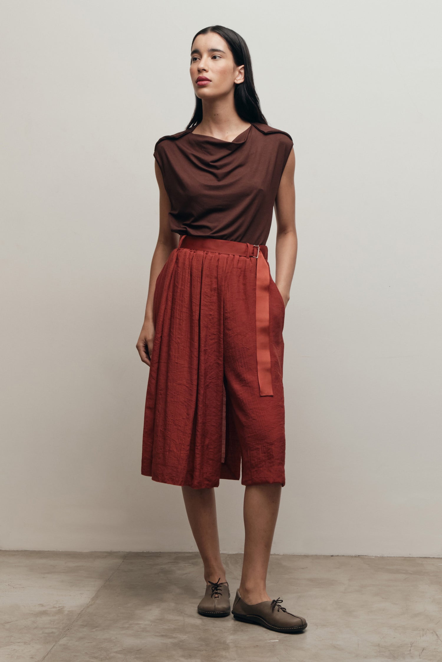 • Bermuda com sobreposição de saia, criando efeito visual sofisticado e moderno