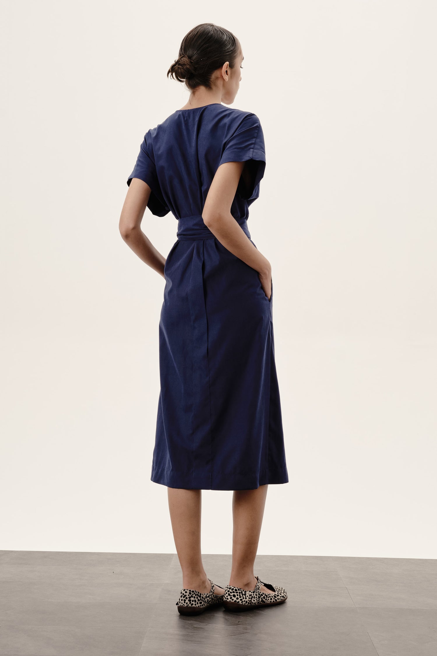 Faixa embutida de amarração para ajuste e definição da cintura.