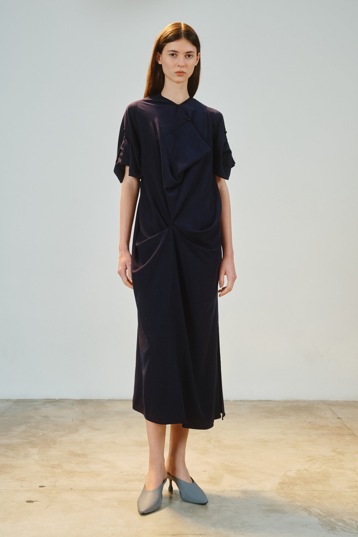 • Botões e rolotês aplicados no decote, mangas e saia, permitindo alterar caimento e comprimento.