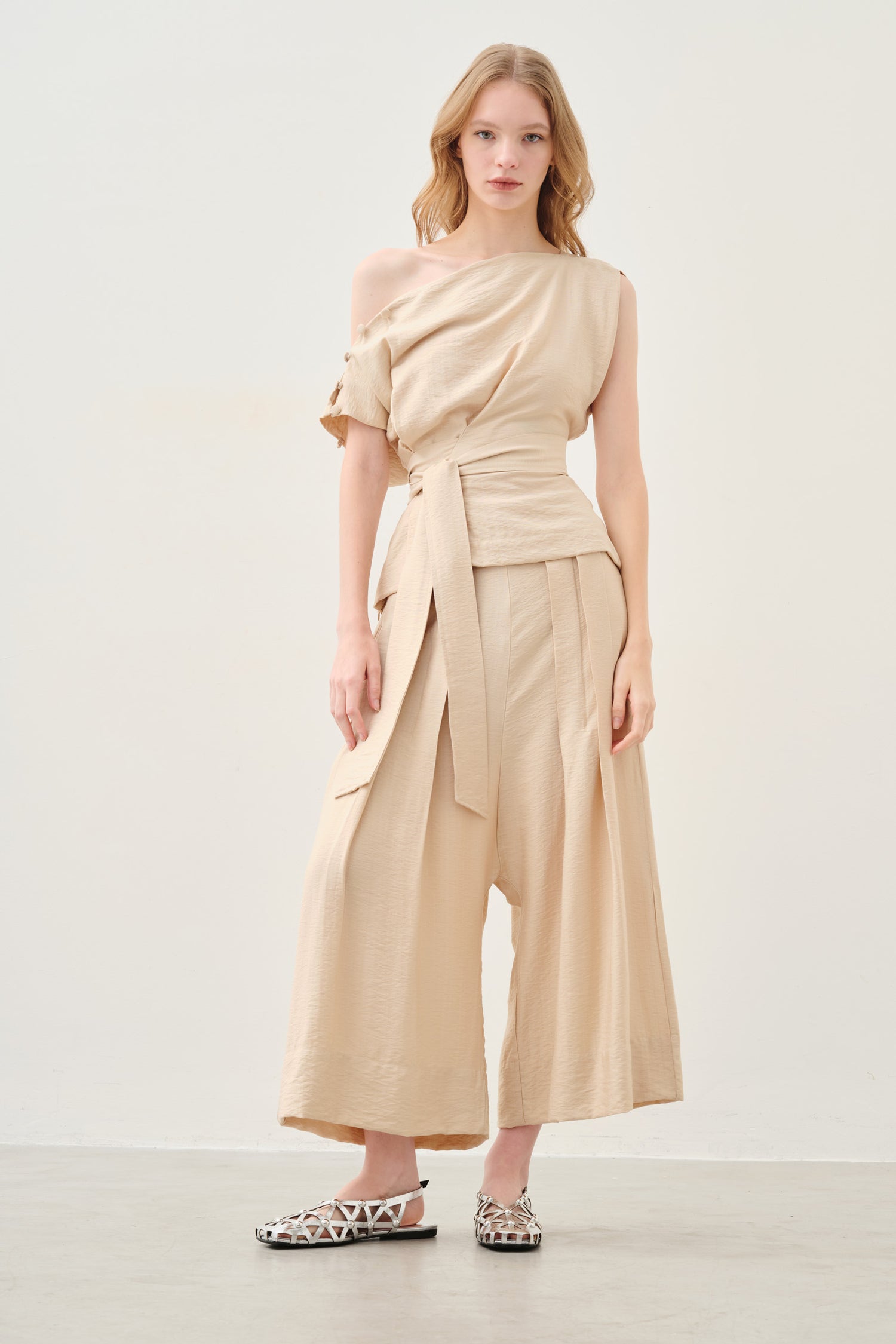 • Blusa de construção arquitetônica com amarração embutida na cintura, permitindo ajustar a silhueta com precisão e elegância