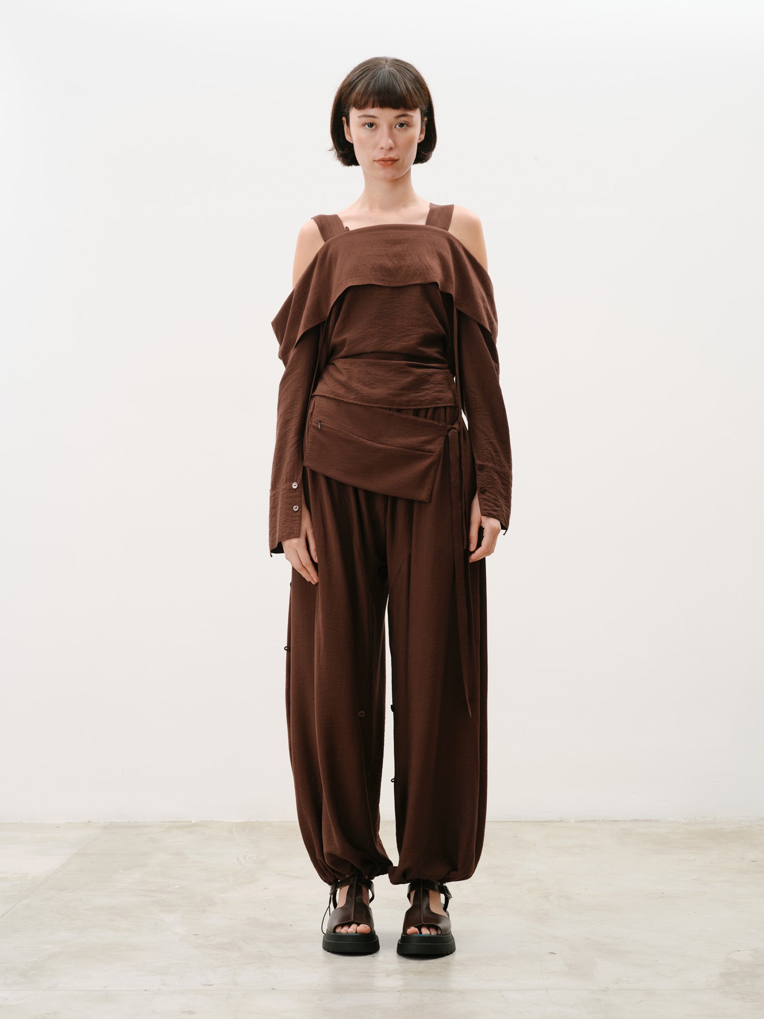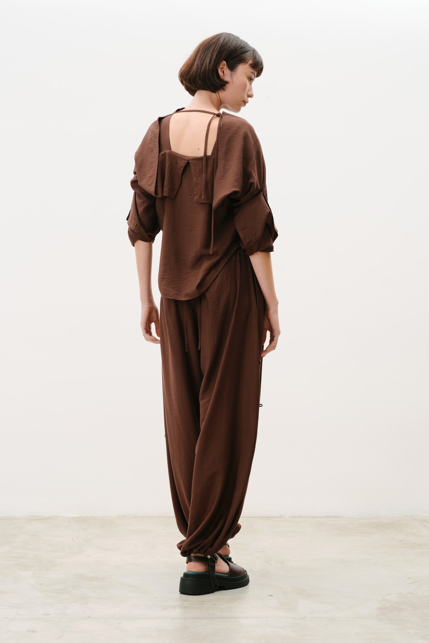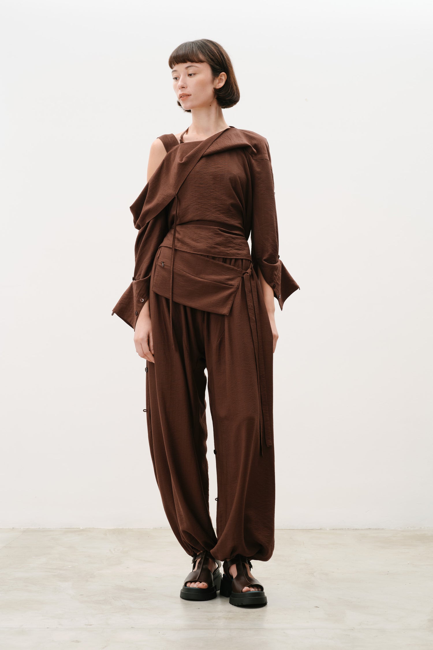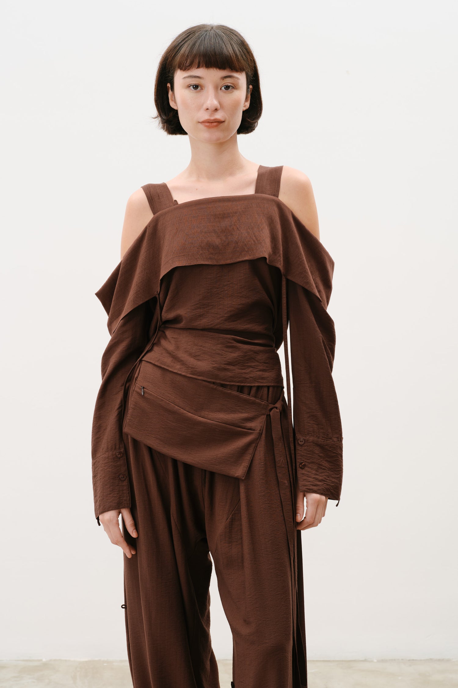 • Cordões no decote permitem transformar a peça em uma blusa assimétrica de um ombro ou em uma silhueta casulo com decote fechado.