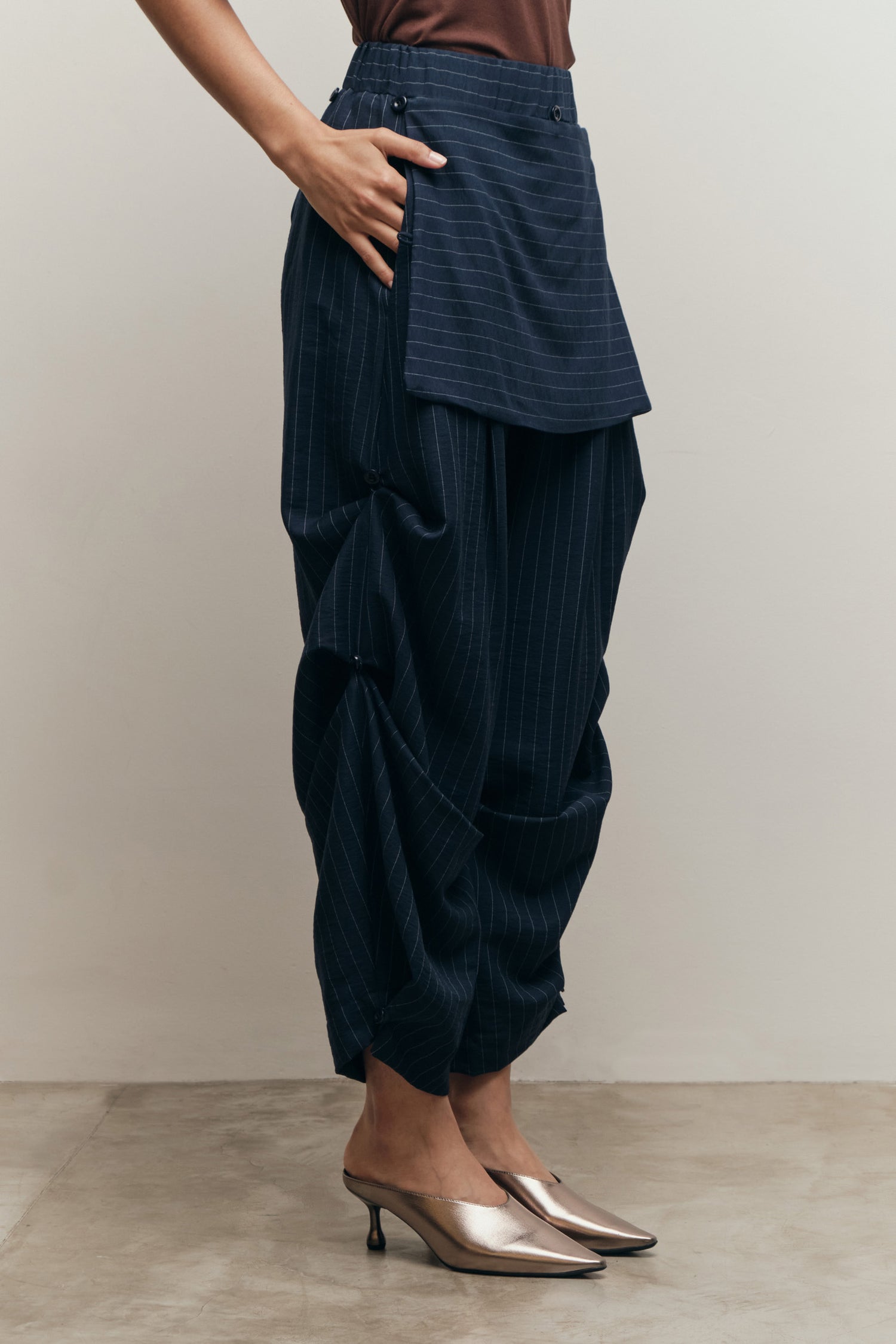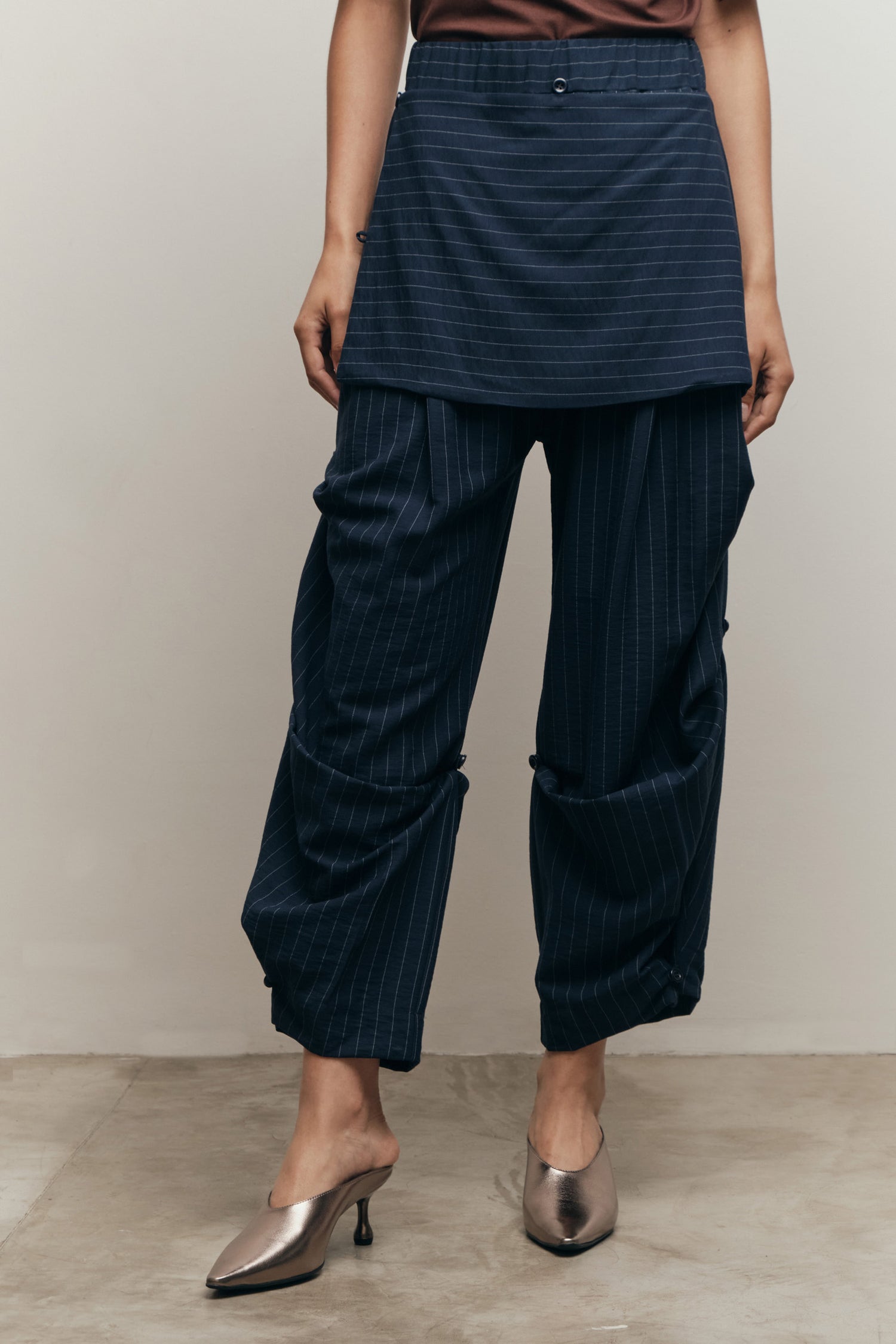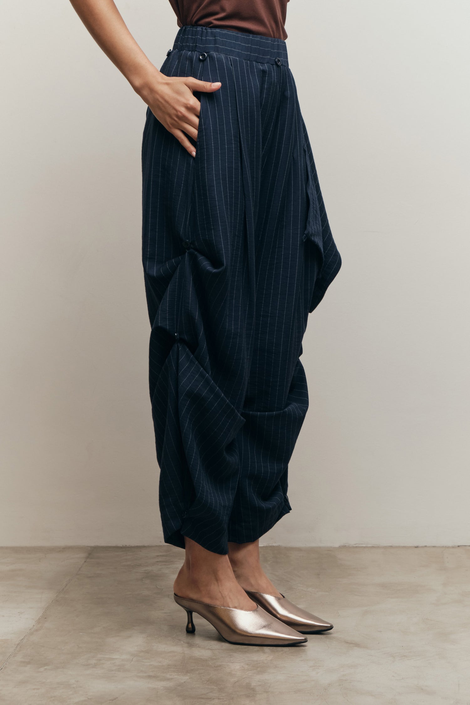 • Calça barrel de shape transformável com botões e rolotês ao longo do comprimento