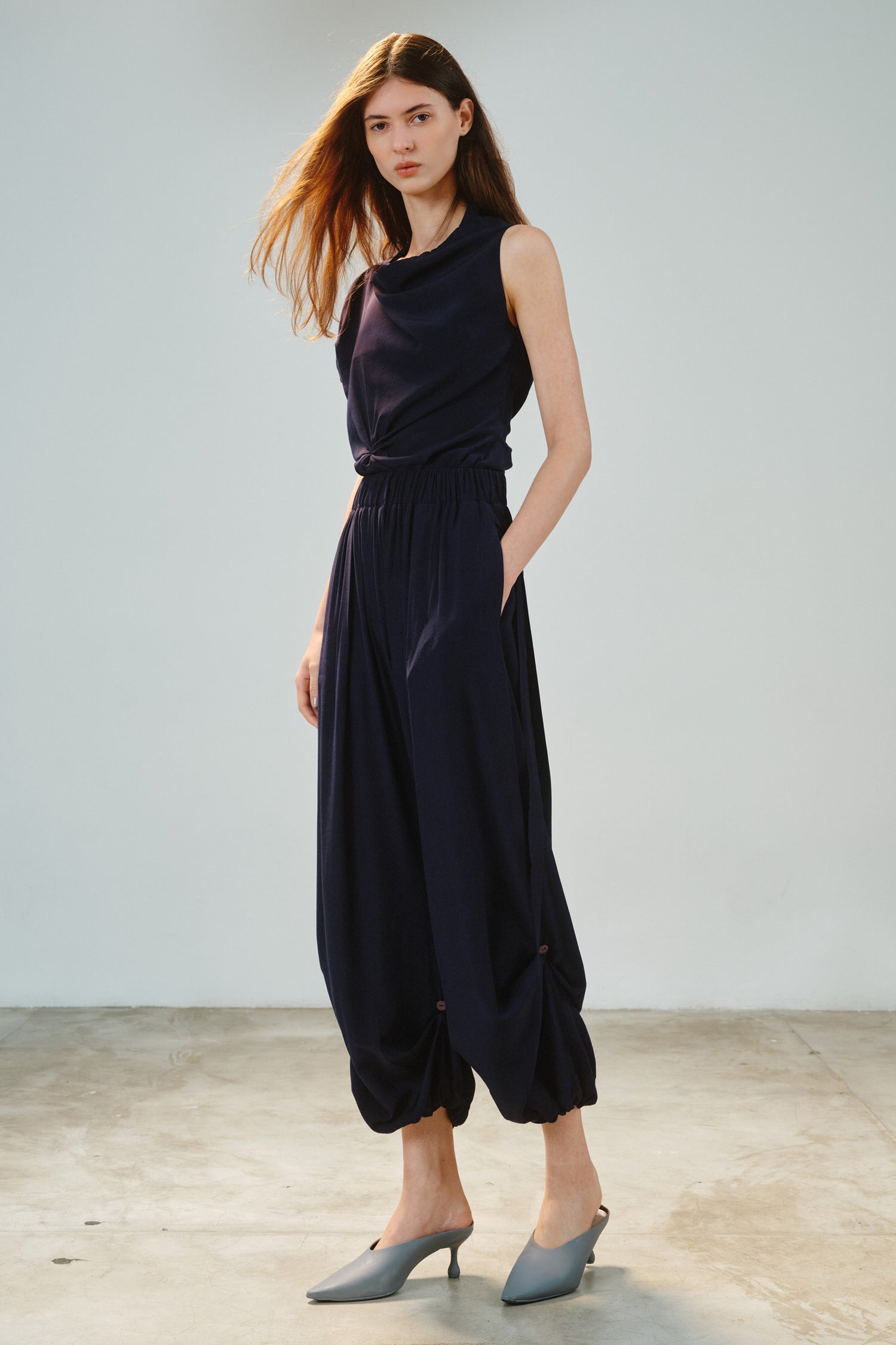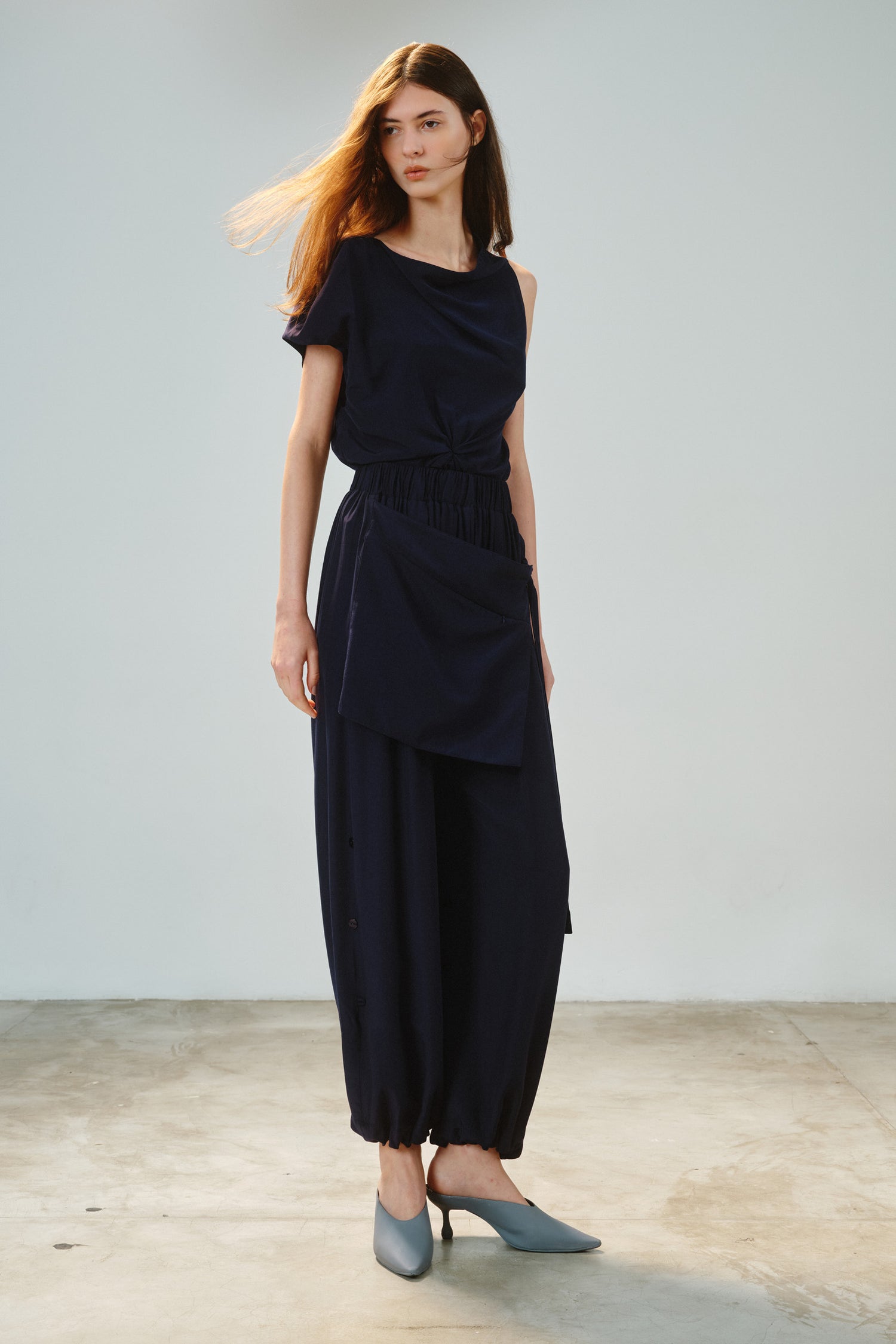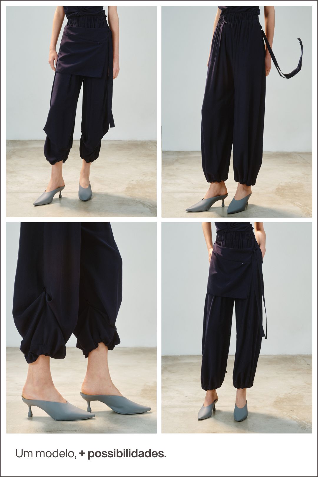 • Botões aplicados na perna possibilitam alterar caimento e comprimento.