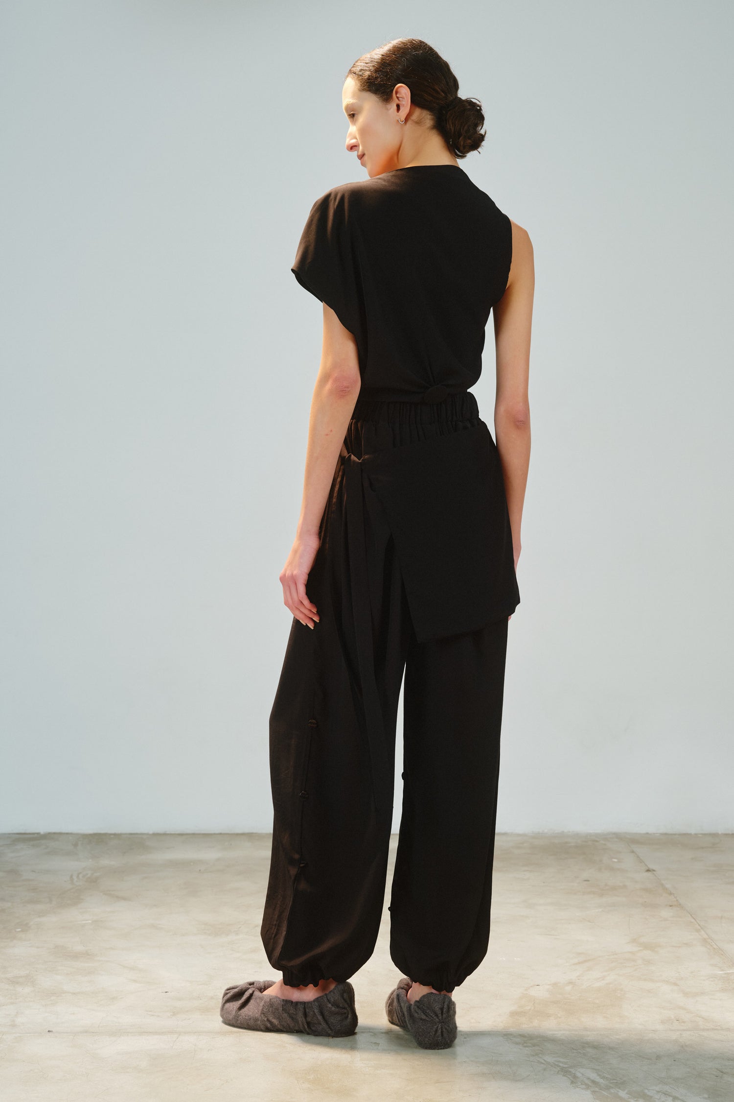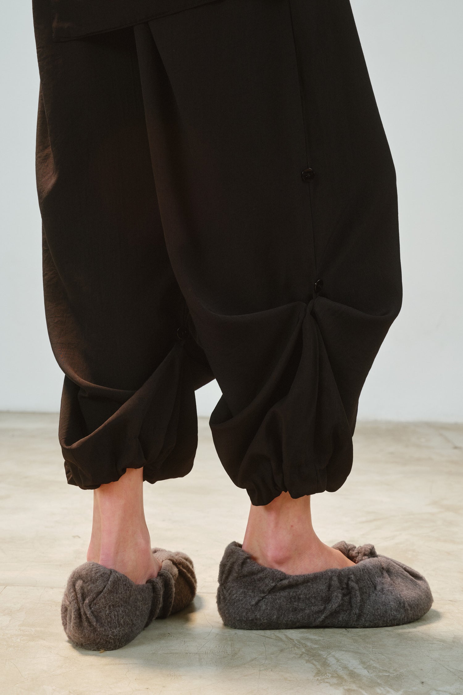 • Botões aplicados na perna possibilitam alterar caimento e comprimento.