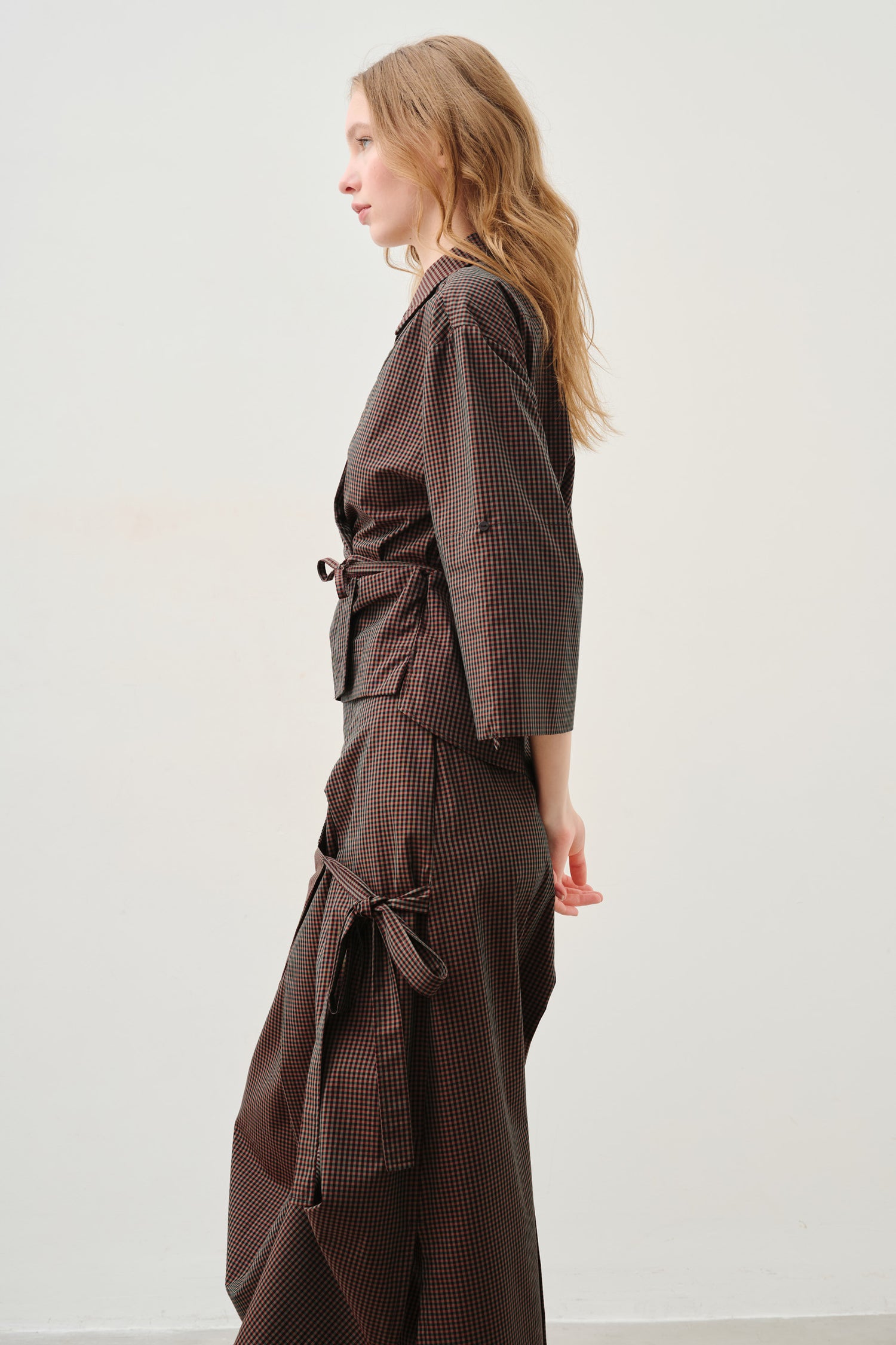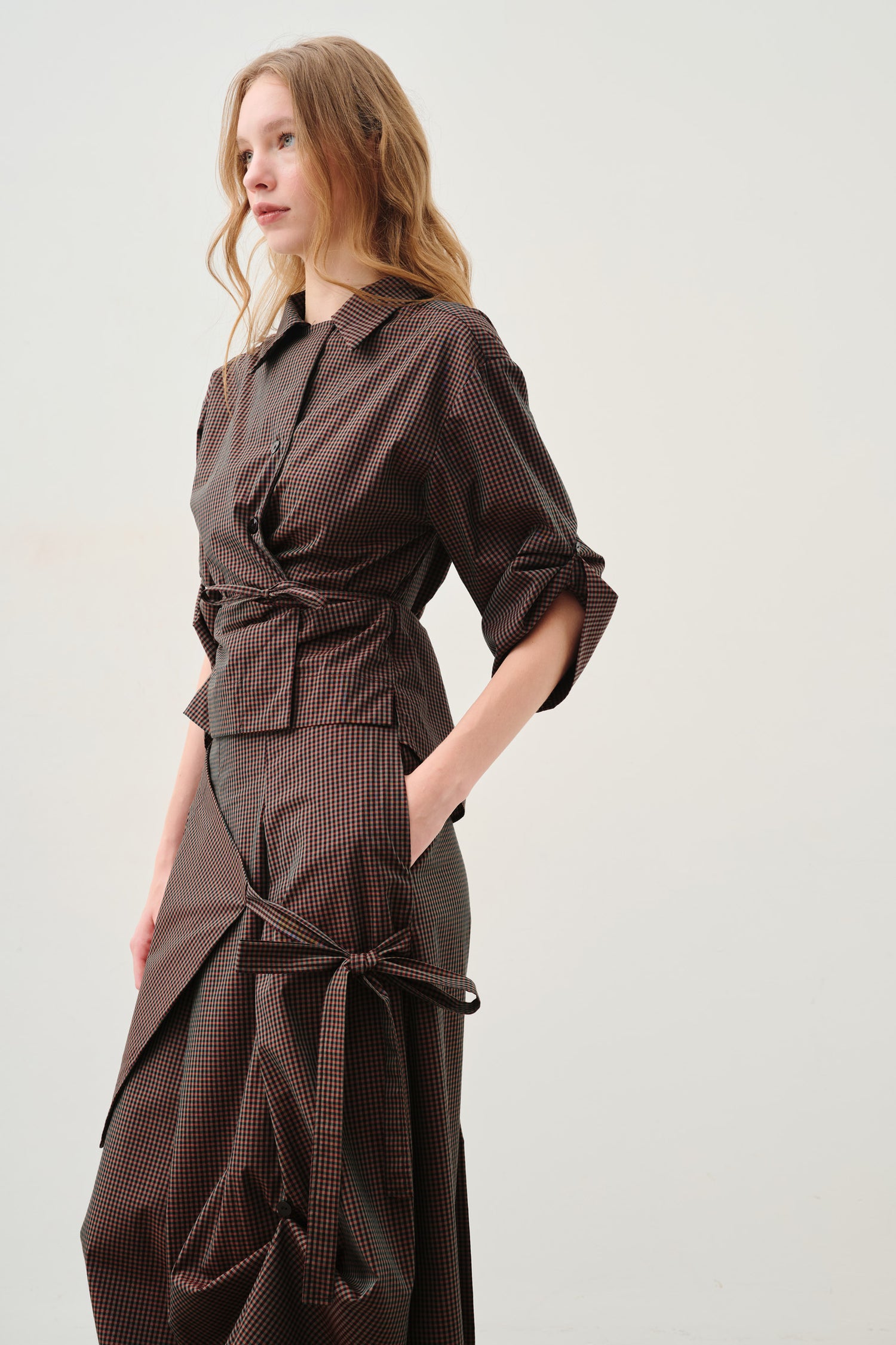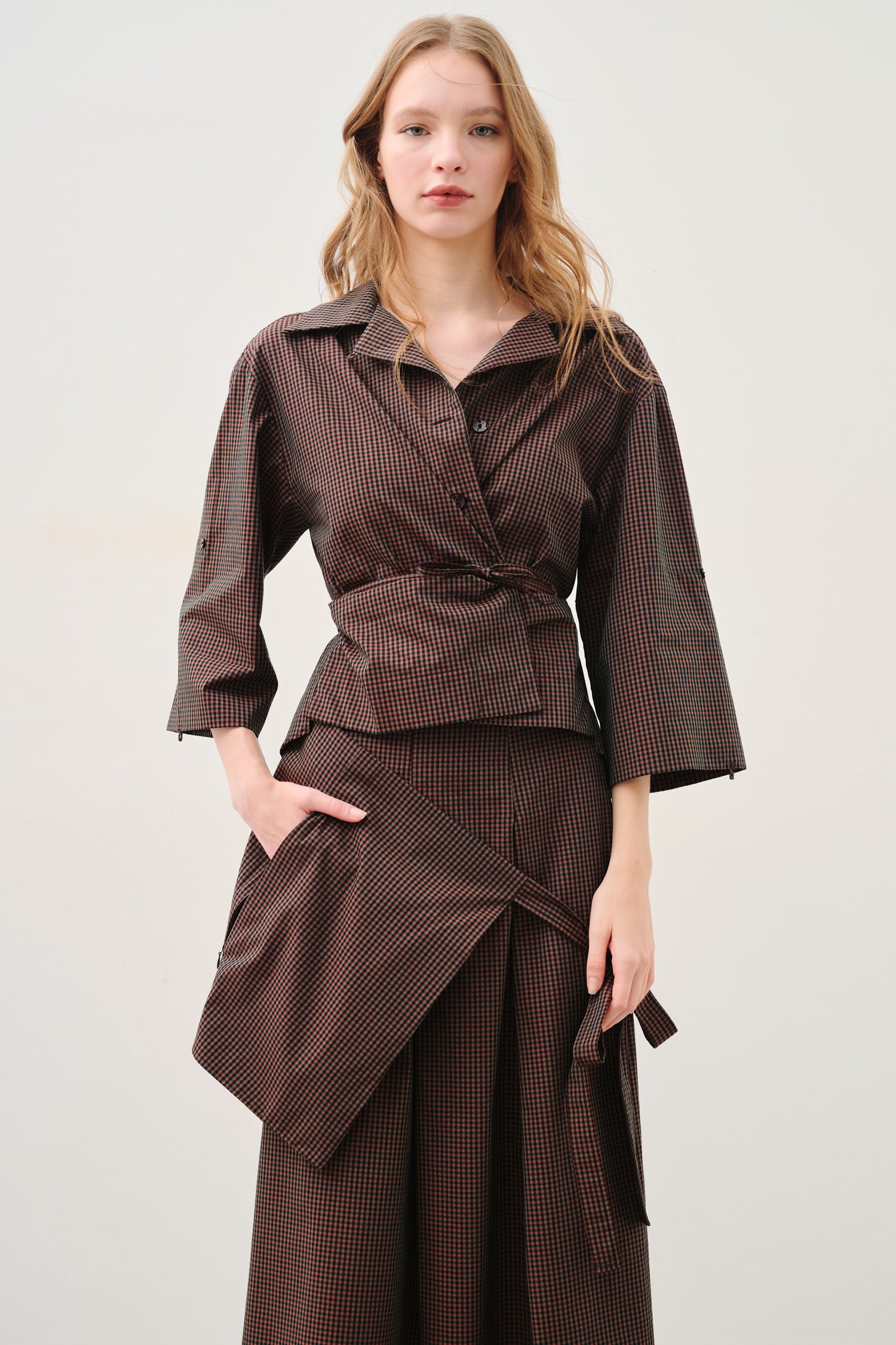 • Uma face com fecho frontal de botões e transpasse ajustável com cordão de amarração, permitindo brincar com proporções e volumes