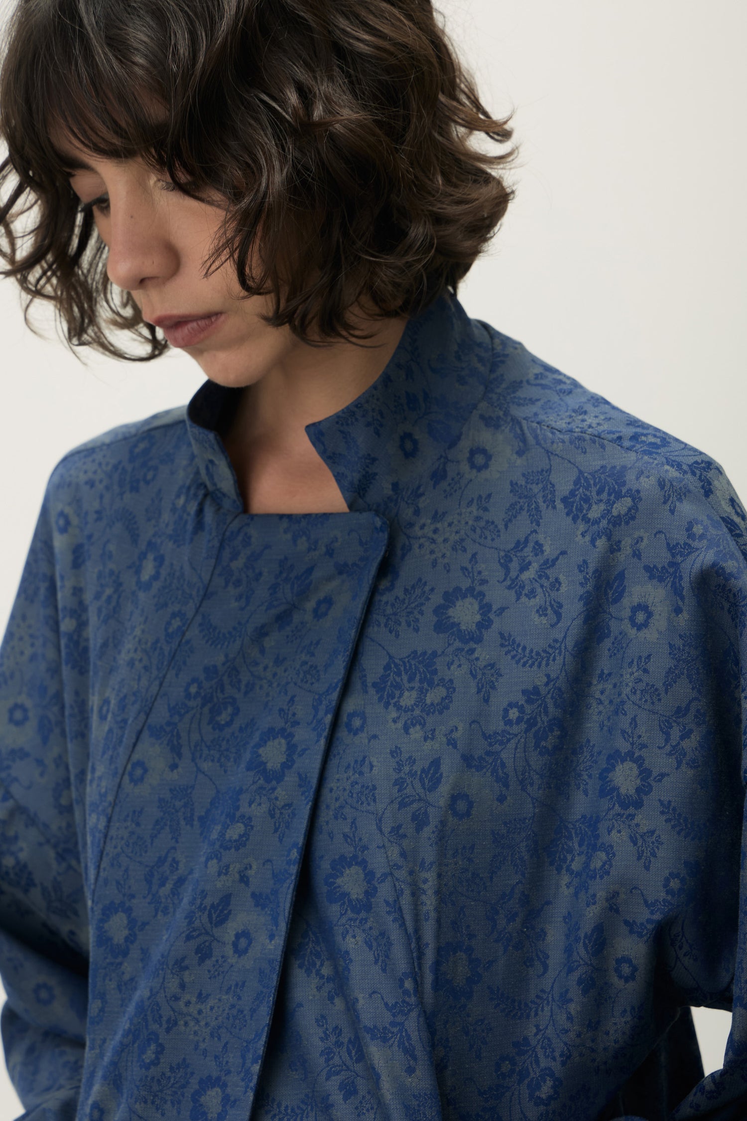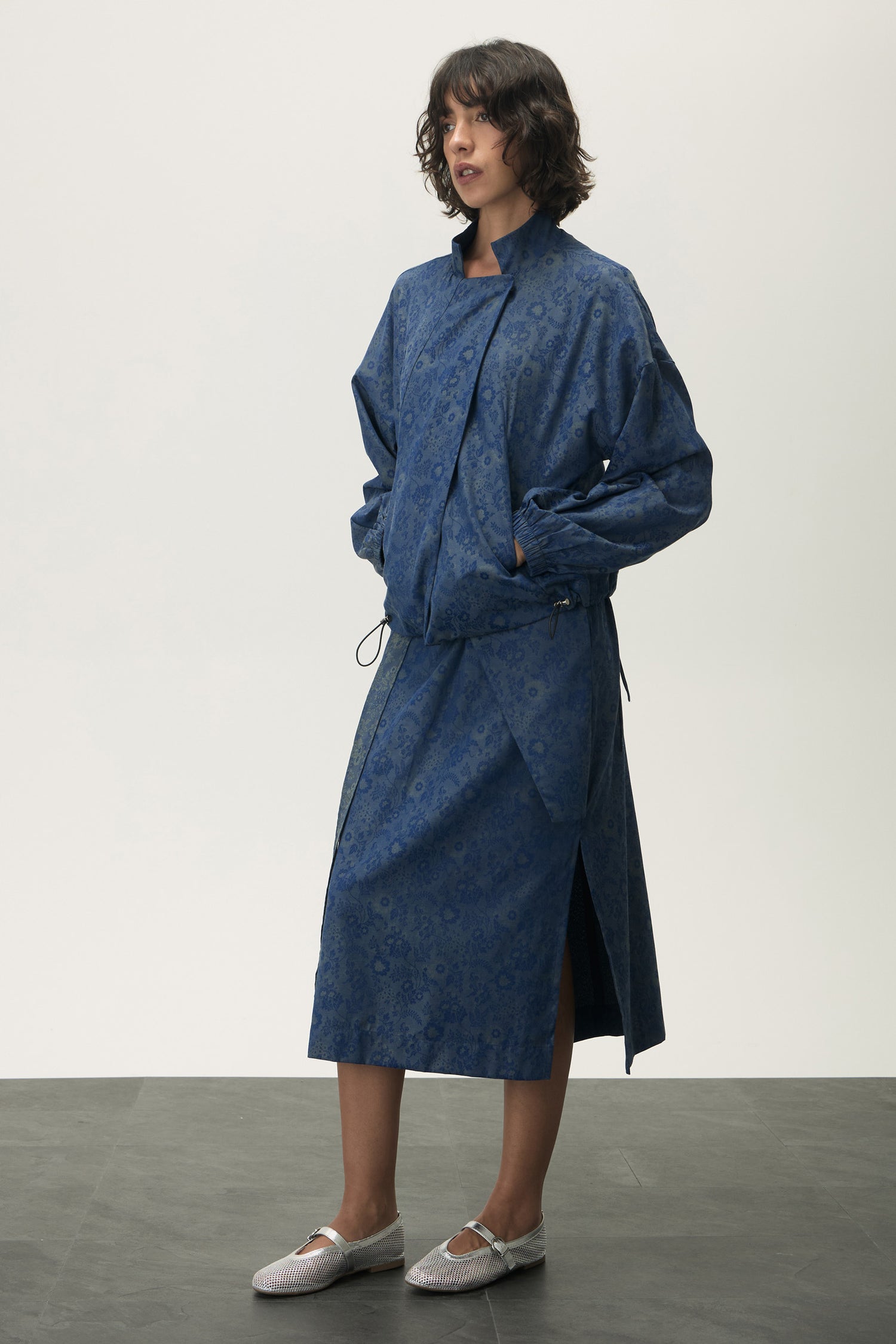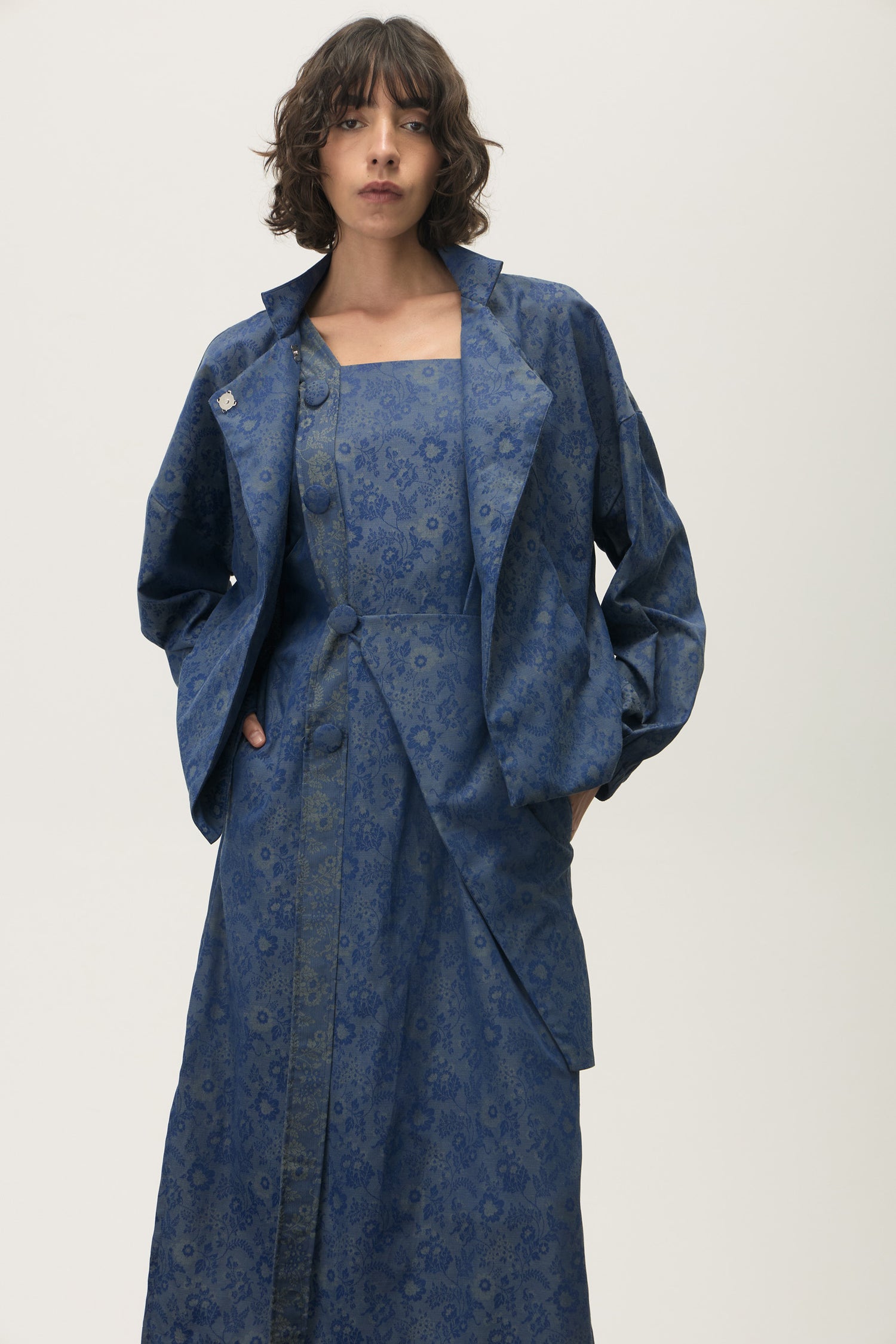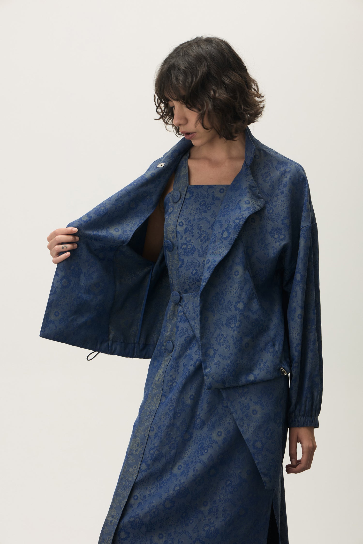 Jaqueta com fechamento por transpasse e botões magnéticos embutidos, que garantem praticidade e acabamento limpo.