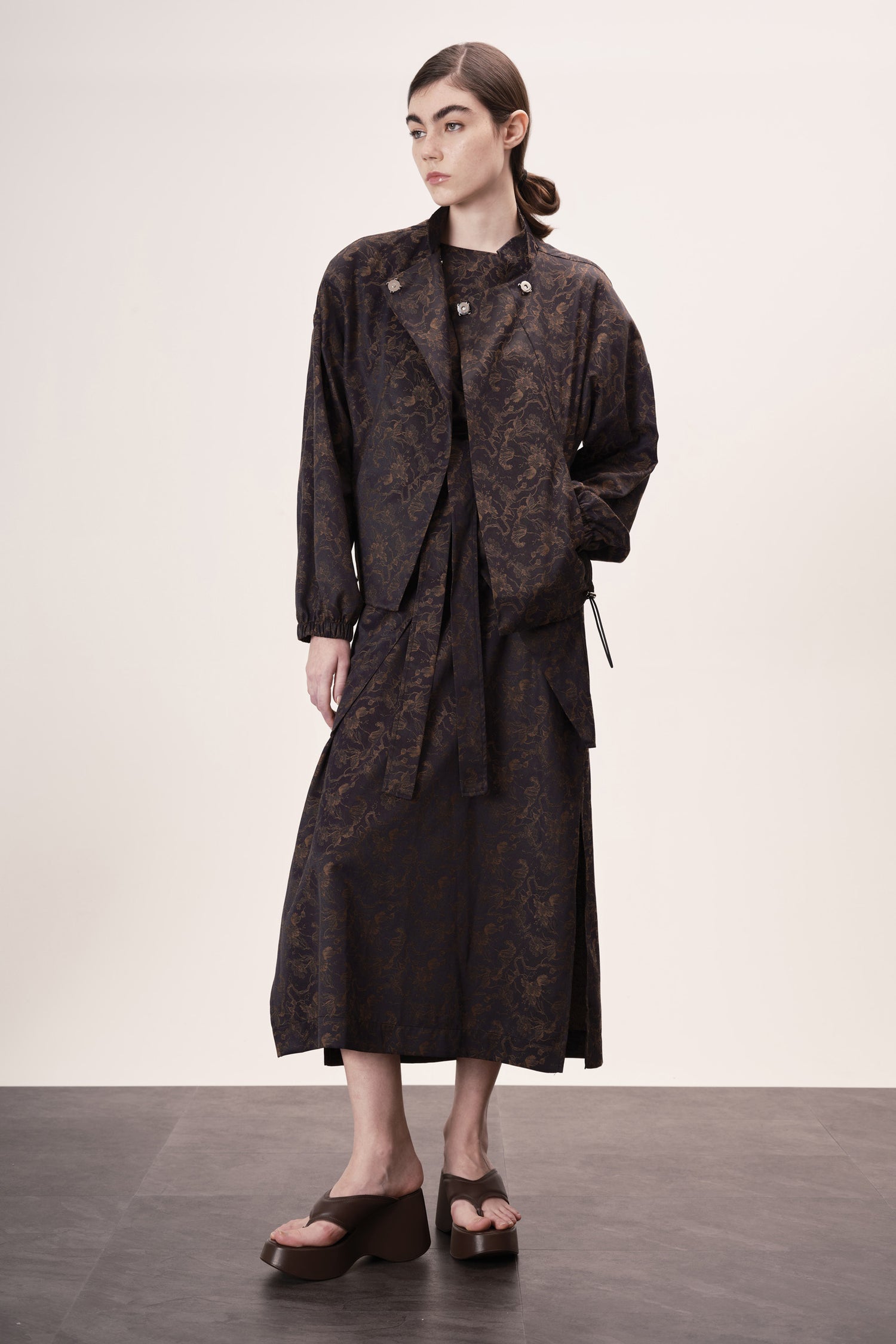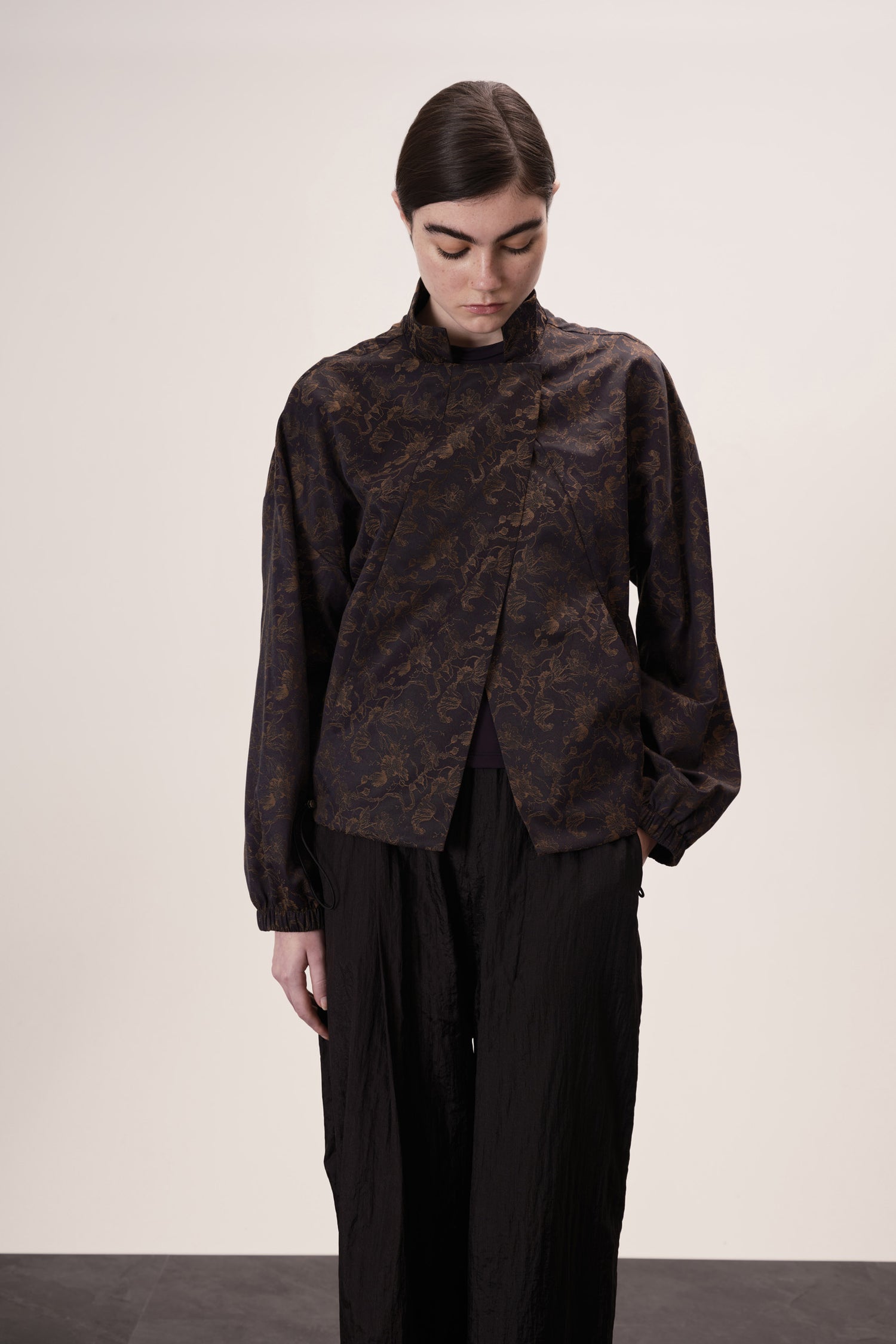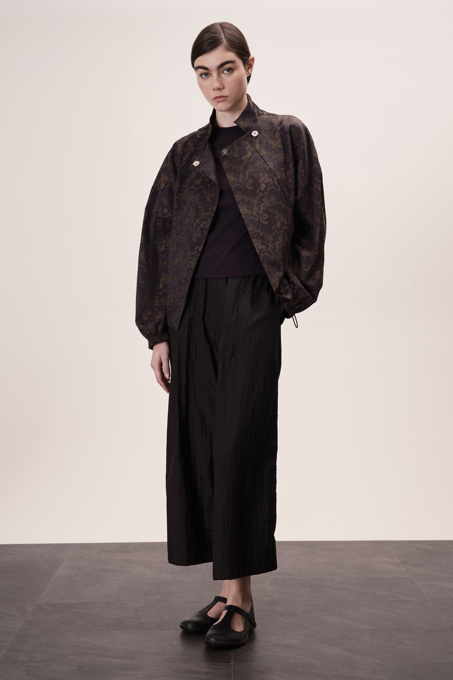 Jaqueta com fechamento por transpasse e botões magnéticos embutidos, que garantem praticidade e acabamento limpo.