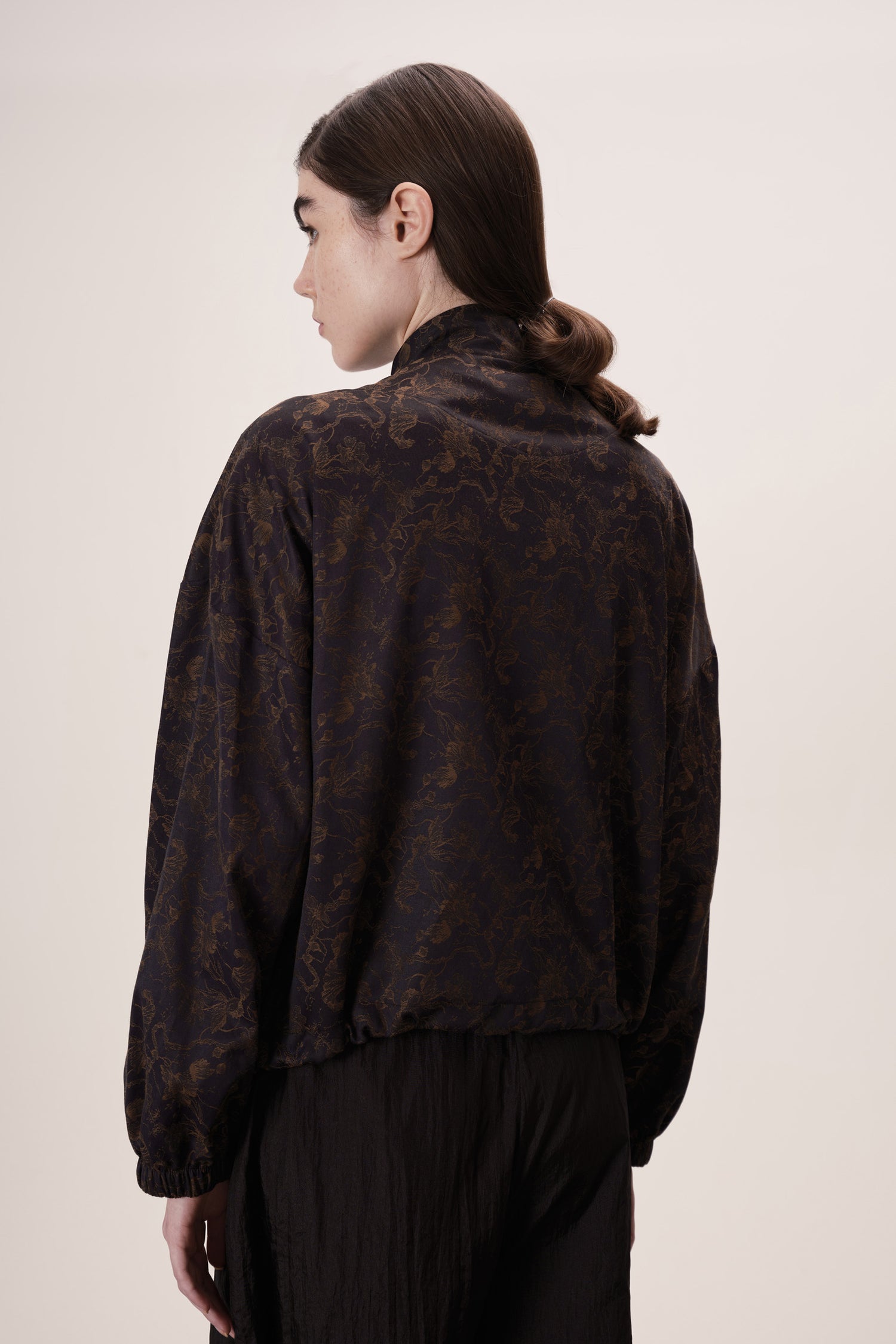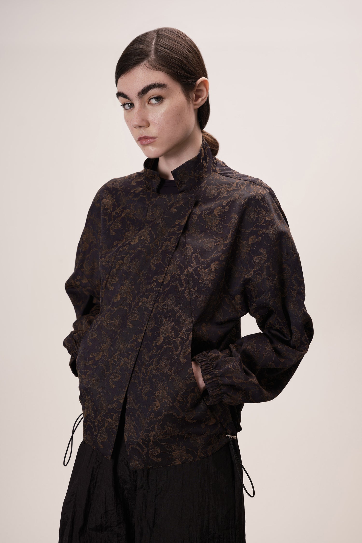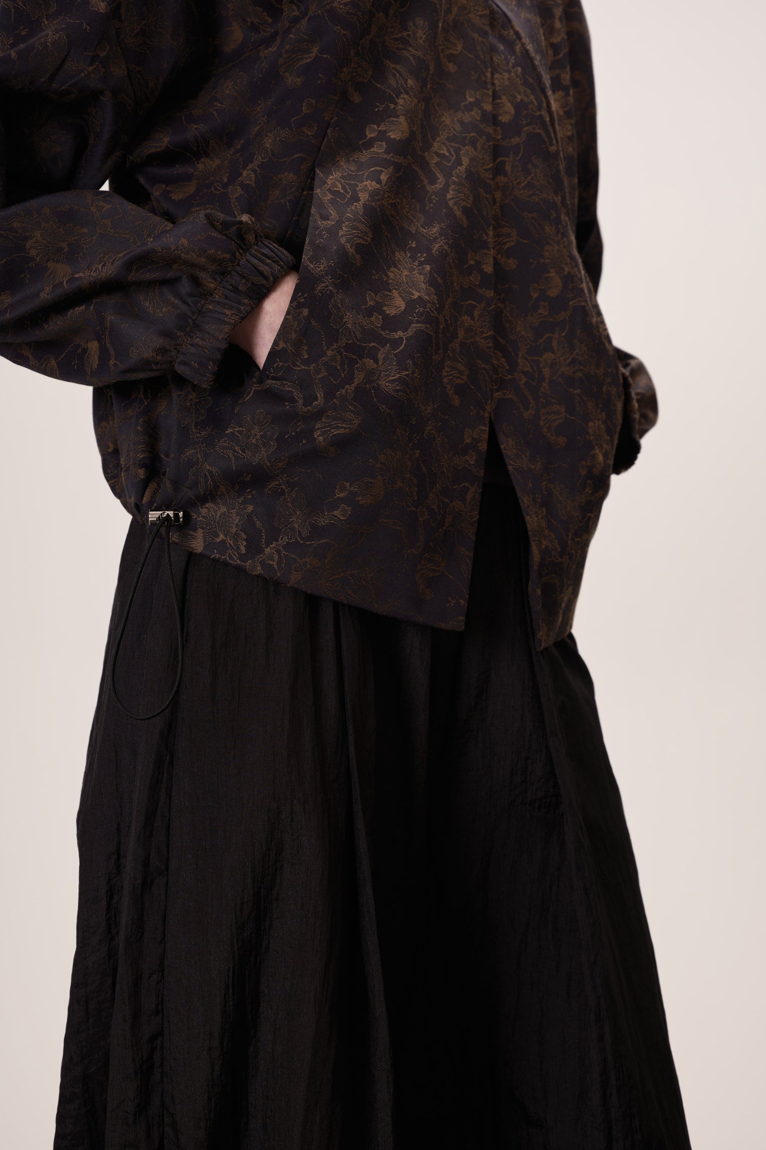 Barra com regulador de elástico e enforcador, permitindo ajustar o caimento conforme o styling — solta para um look descontraído ou ajustada para um efeito mais estruturado.