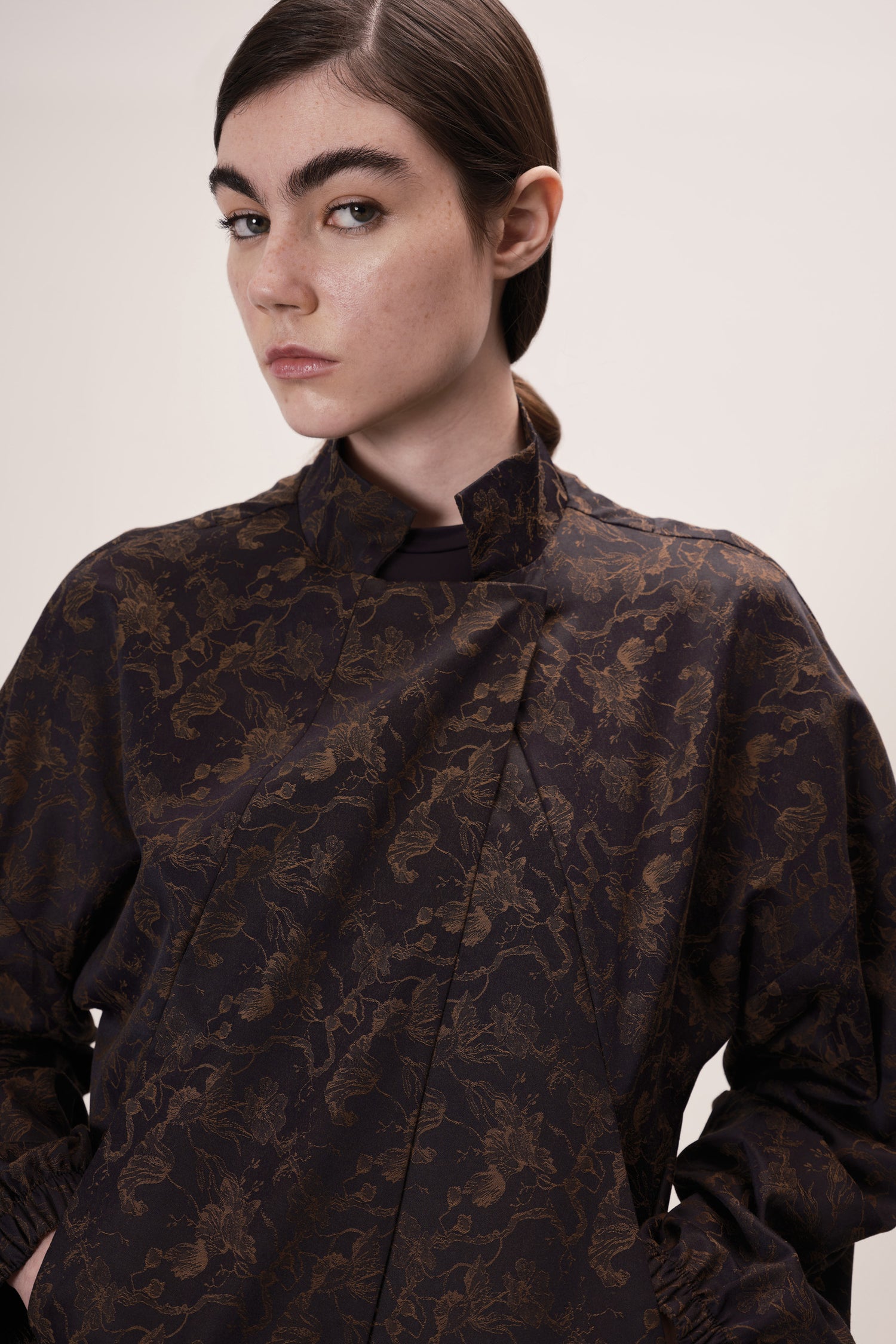 Mangas com volume abaulado, criando uma silhueta marcante e contemporânea
