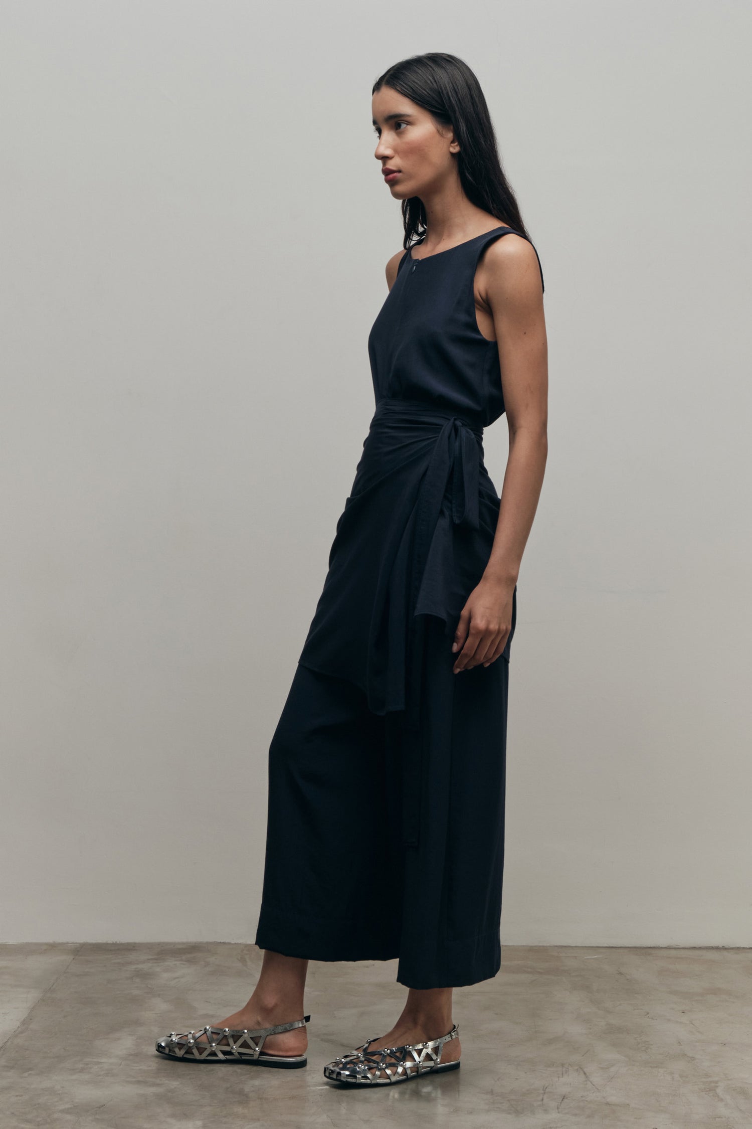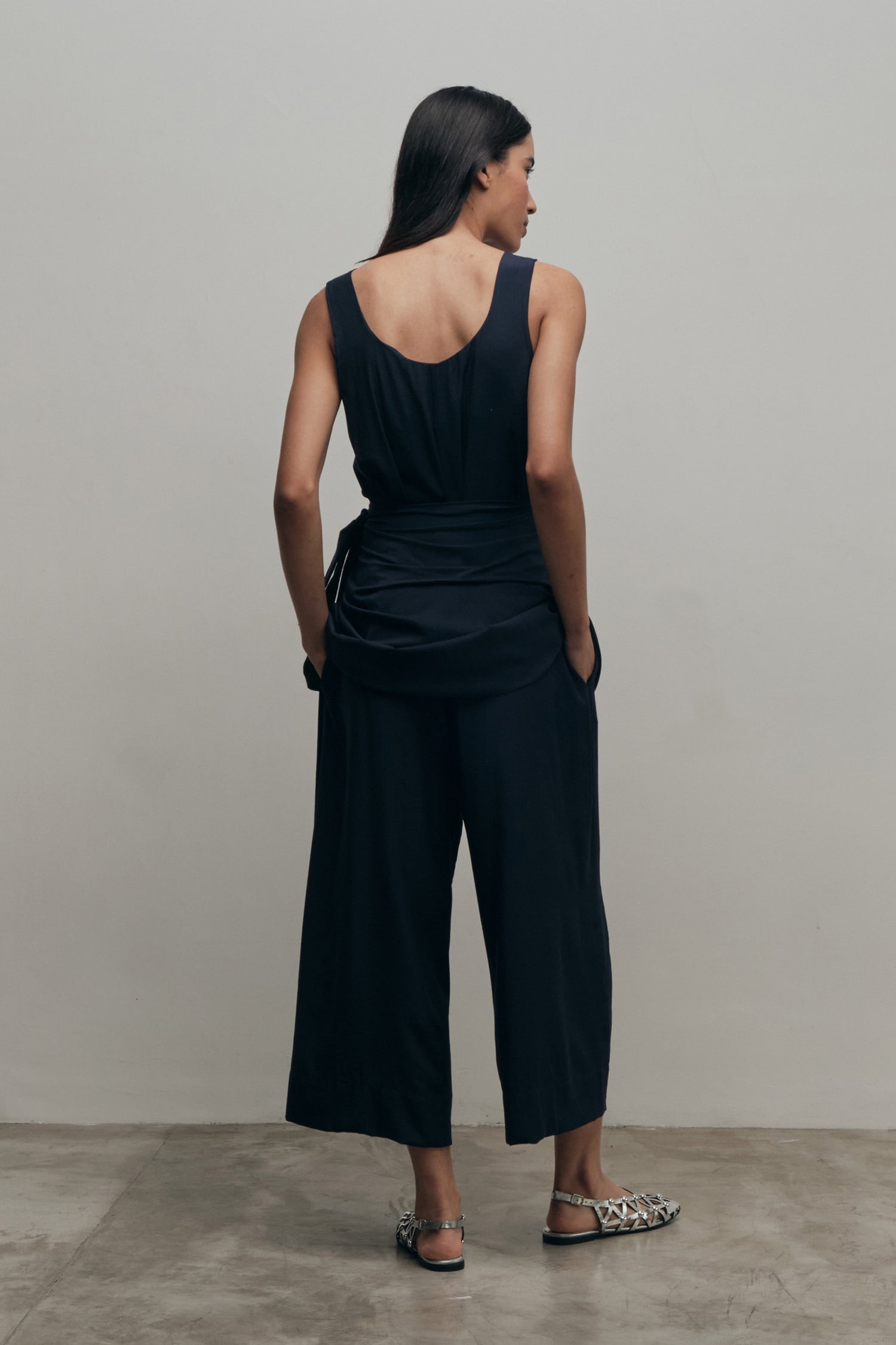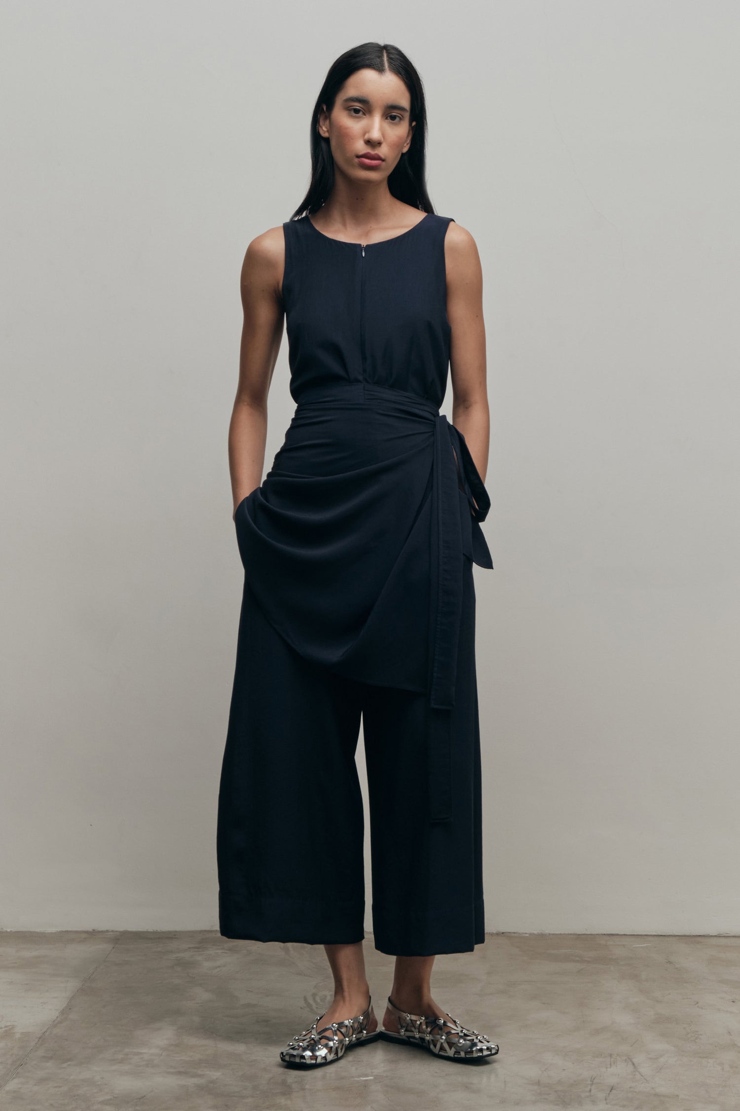 • Macacão sem mangas com construção de alfaiataria em tecido leve e fluido