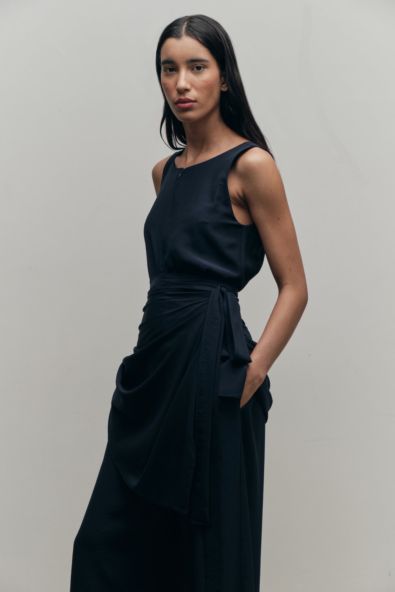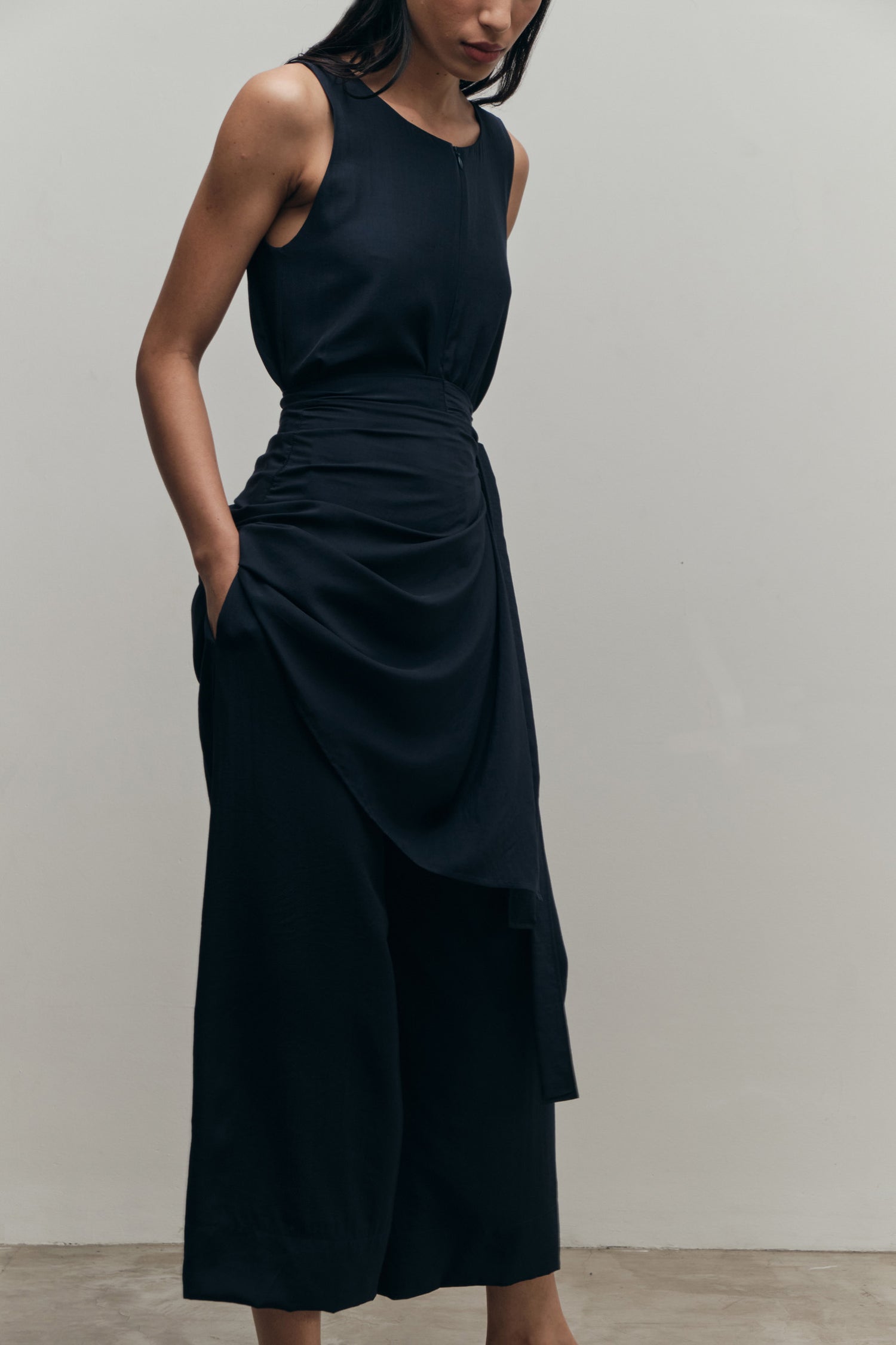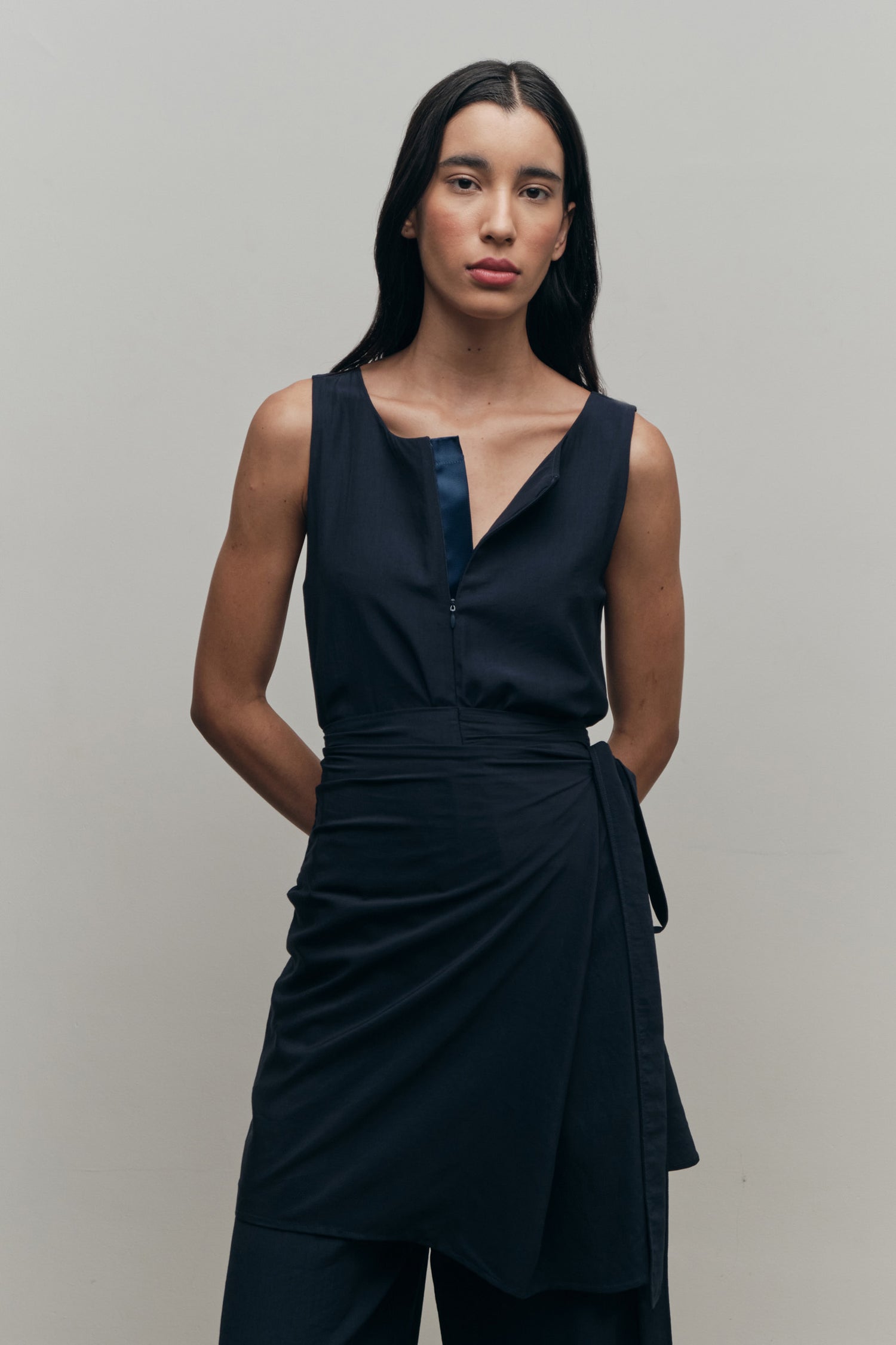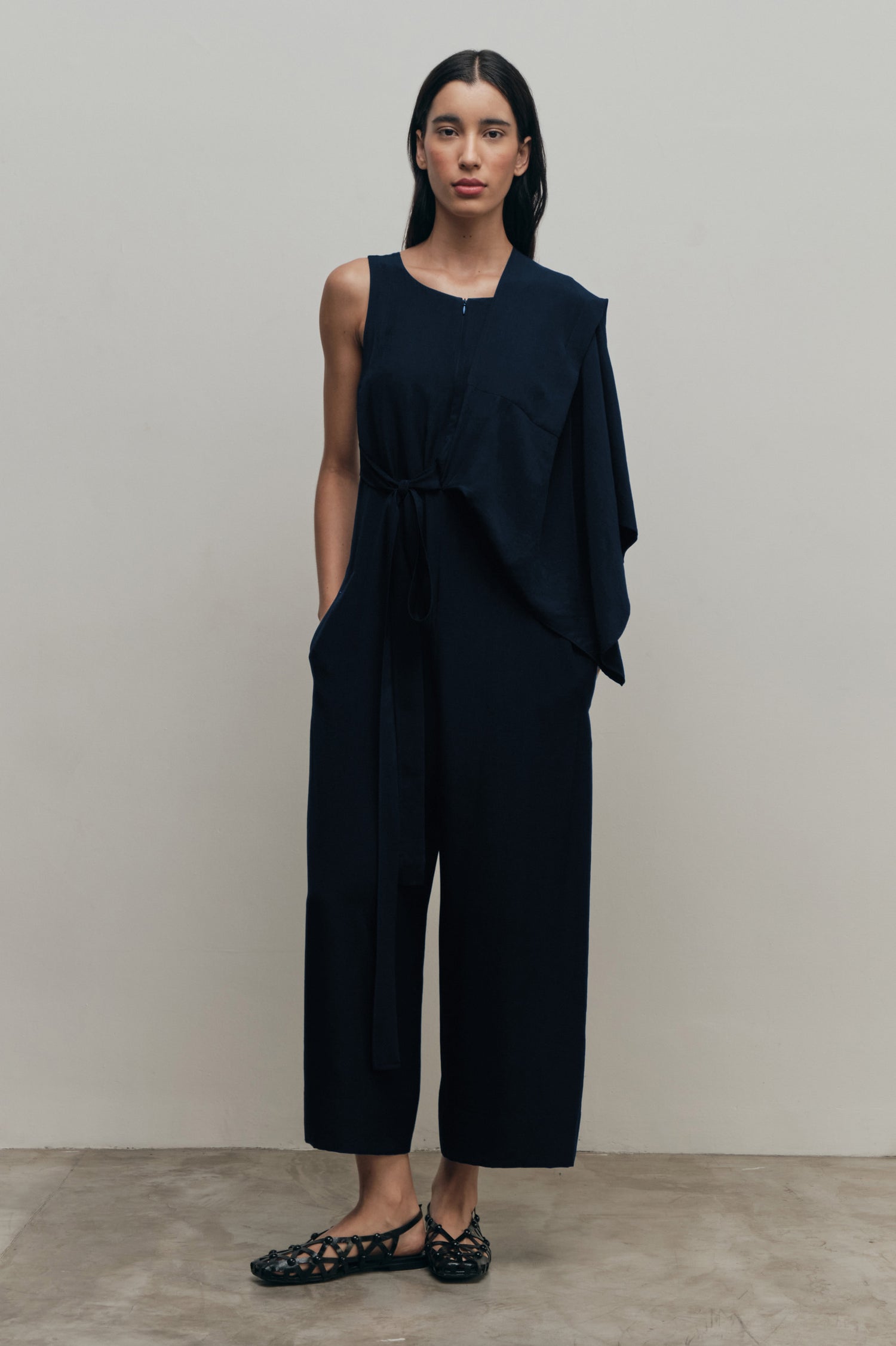 • Macacão sem mangas com construção de alfaiataria em tecido leve e fluido