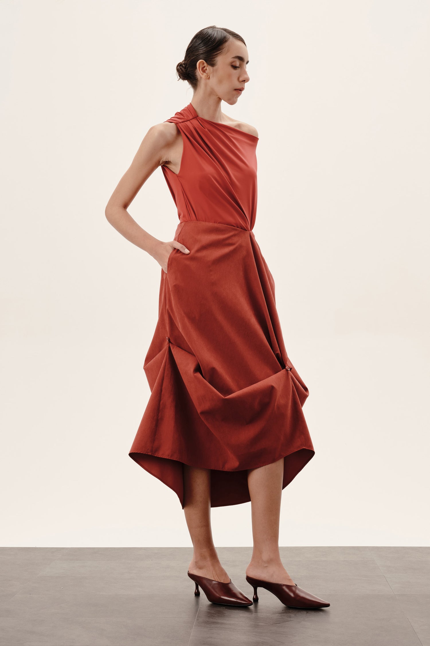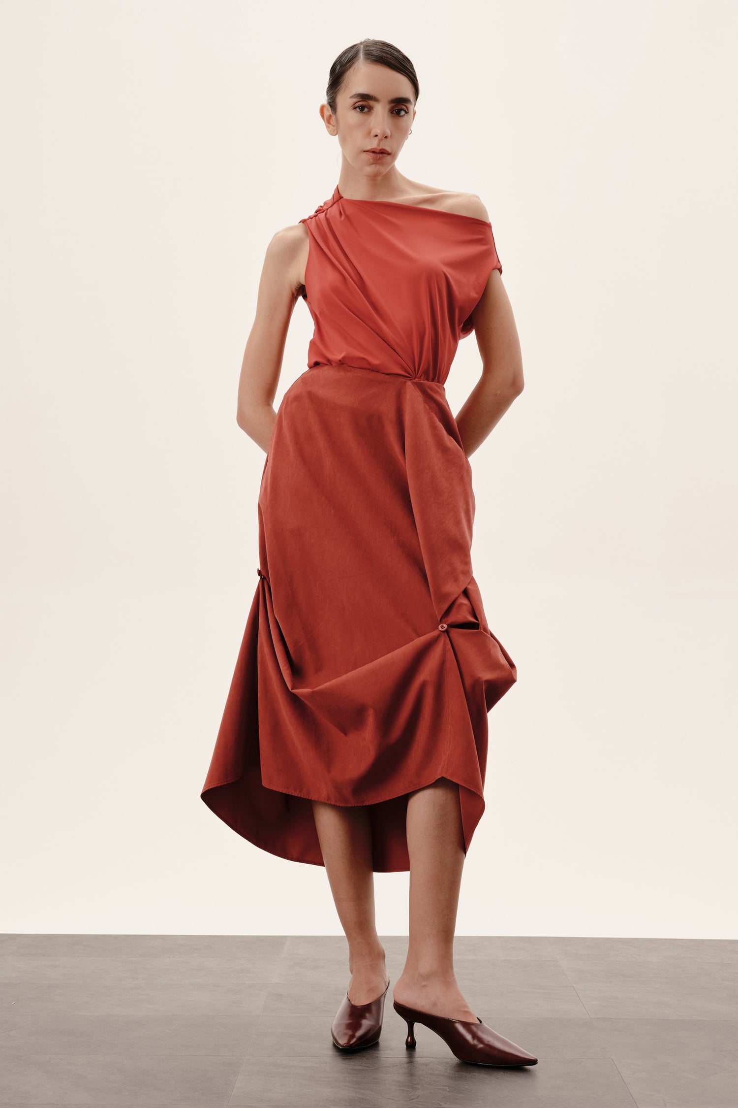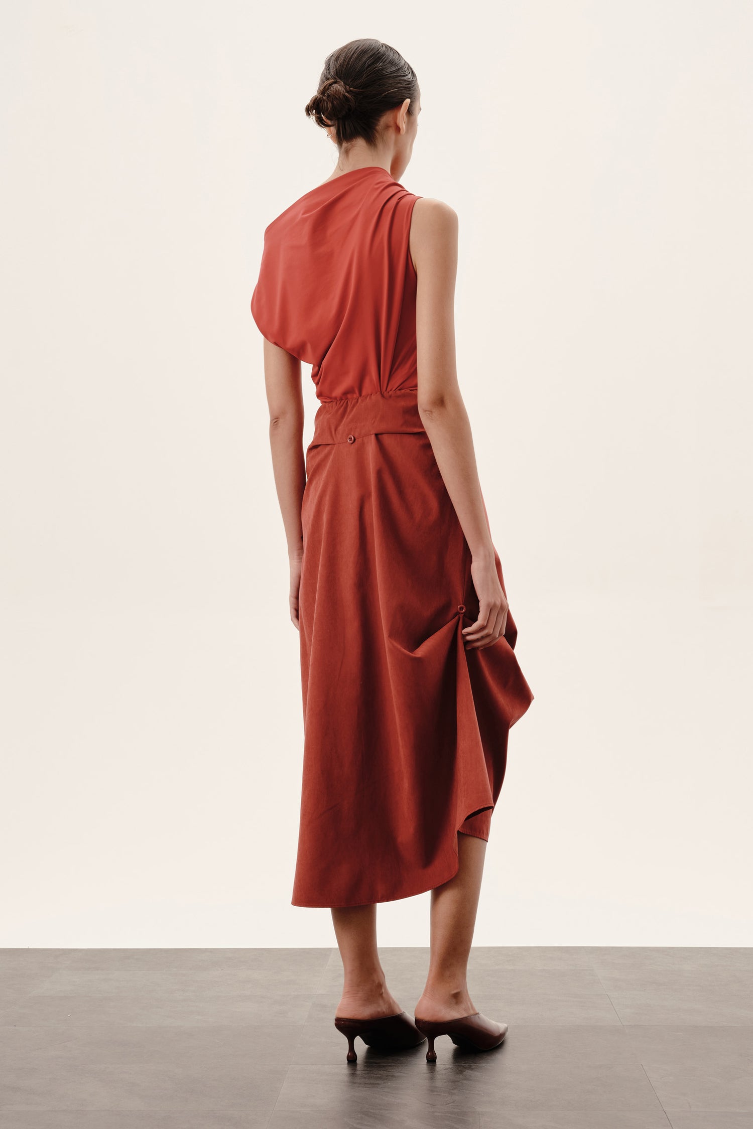 Botões e rolotês posicionados para possibilitar ajustes personalizados, formando drapeados e dobras que adicionam dinamismo ao look.