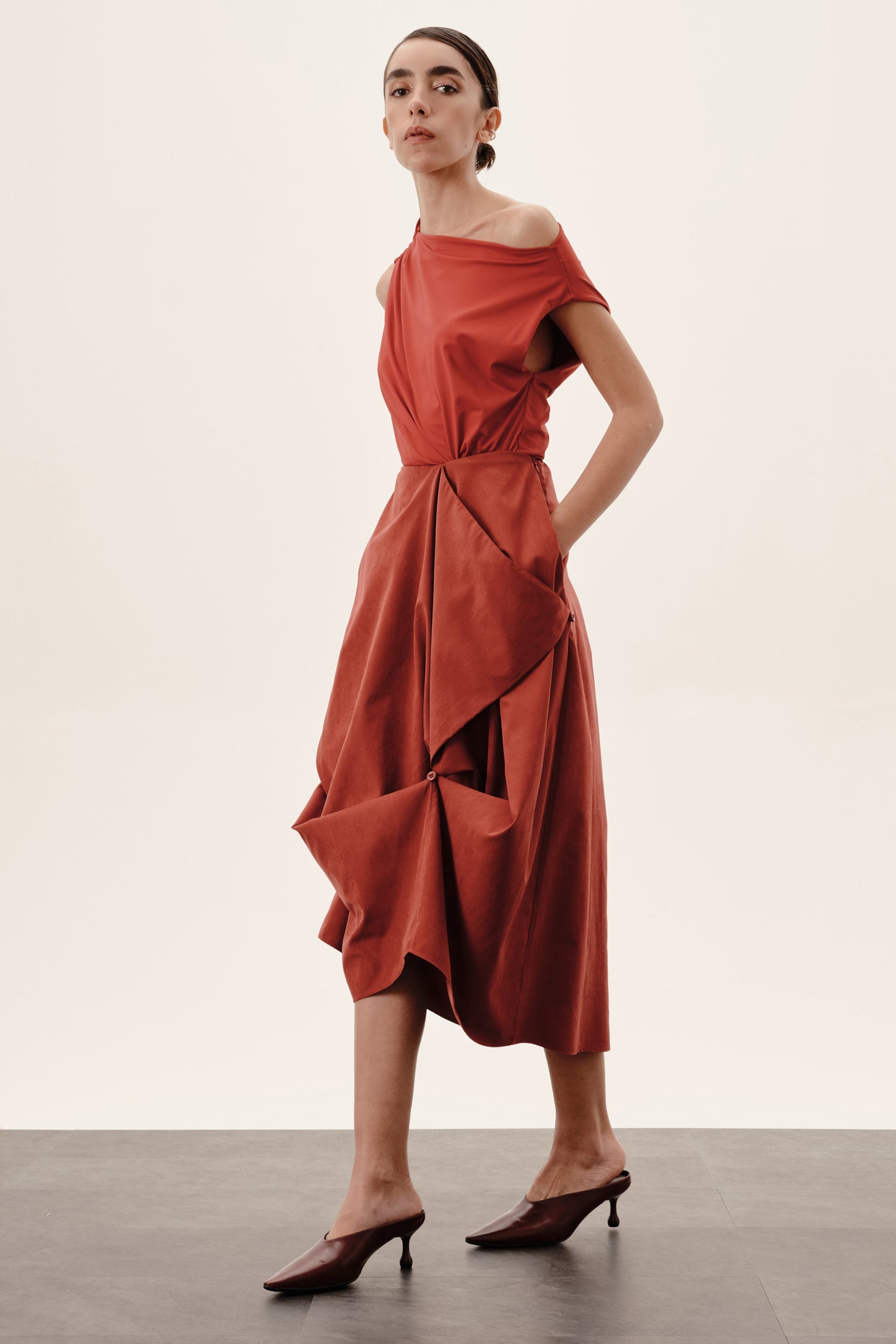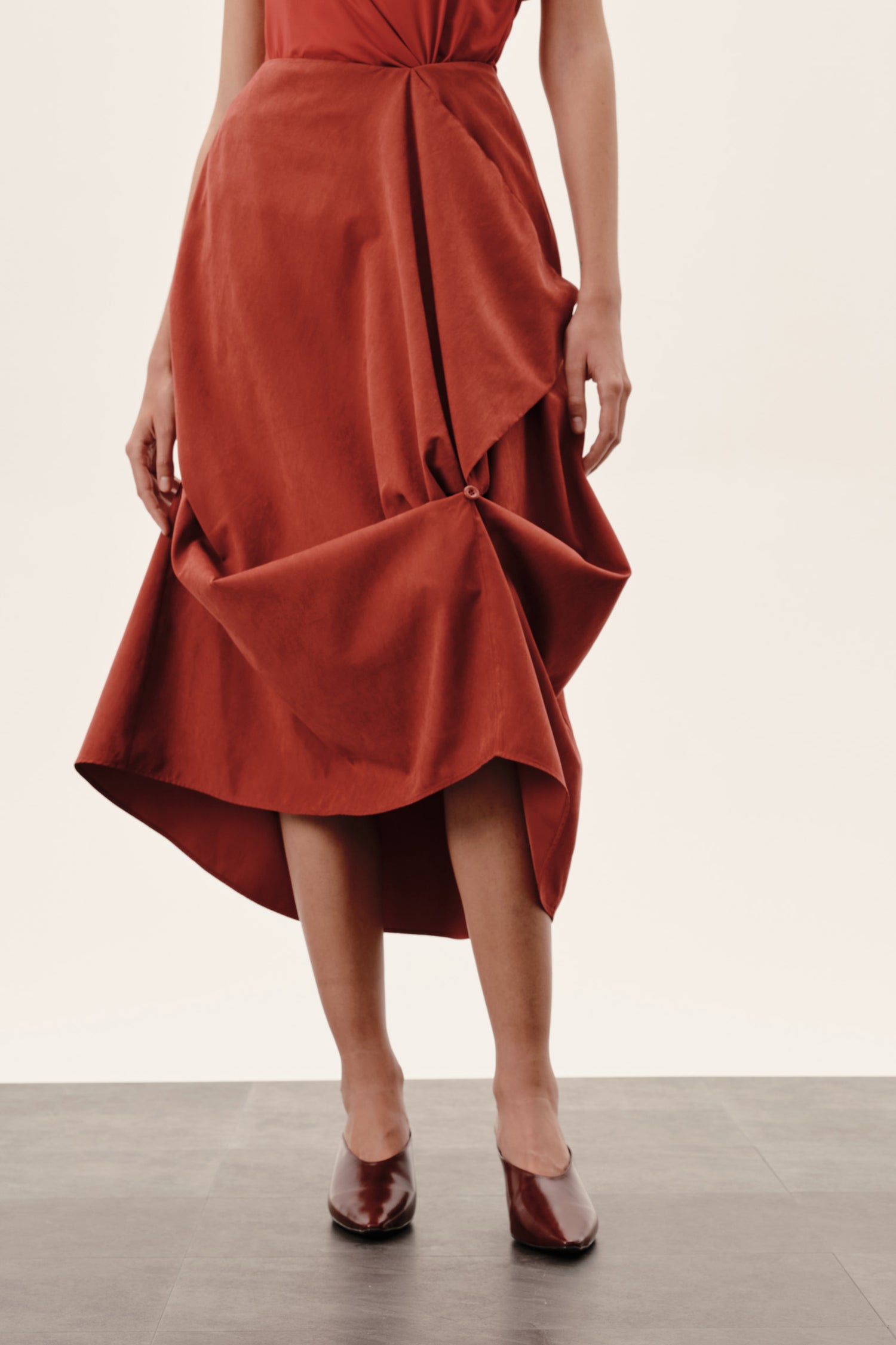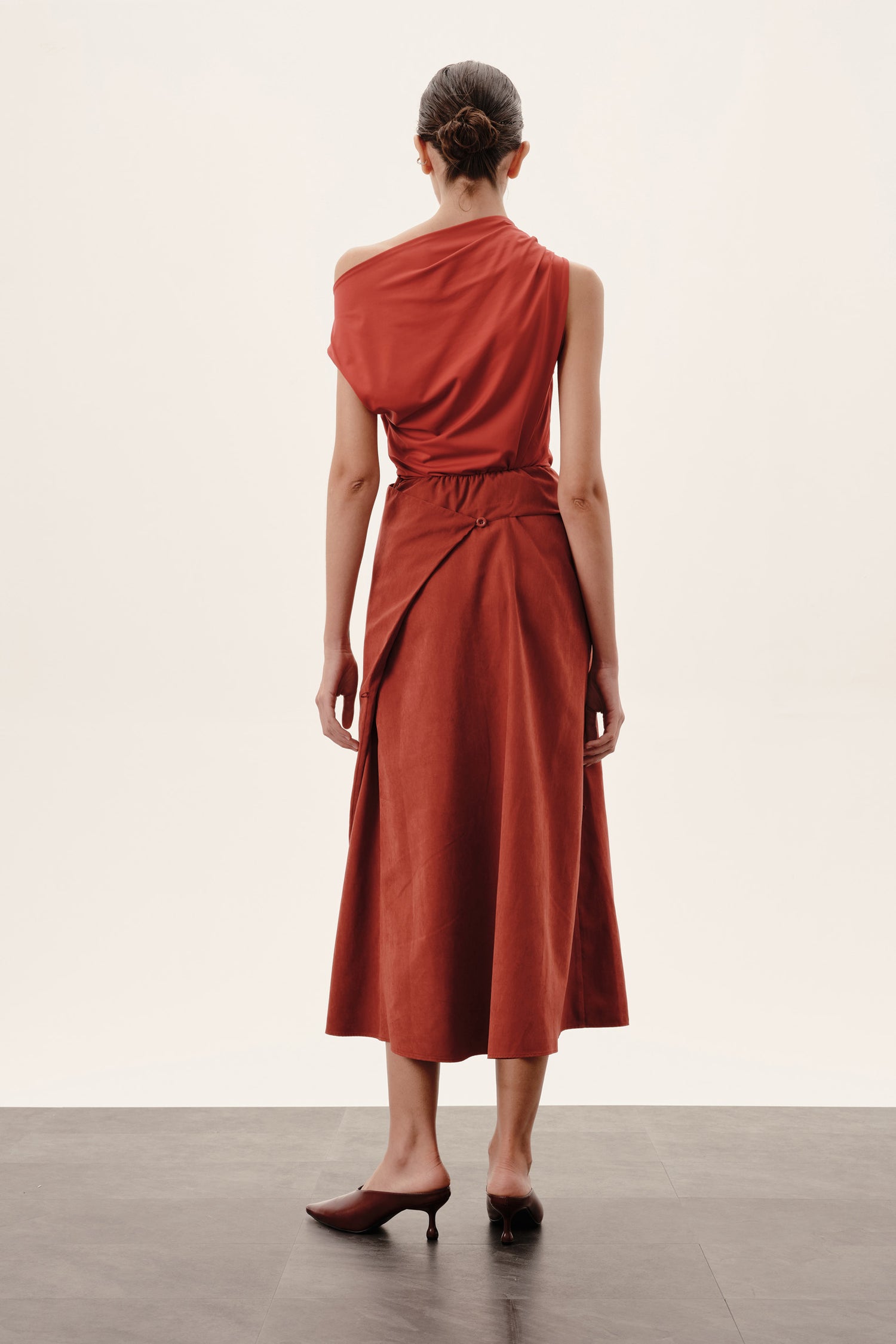 Botões e rolotês posicionados para possibilitar ajustes personalizados, formando drapeados e dobras que adicionam dinamismo ao look.