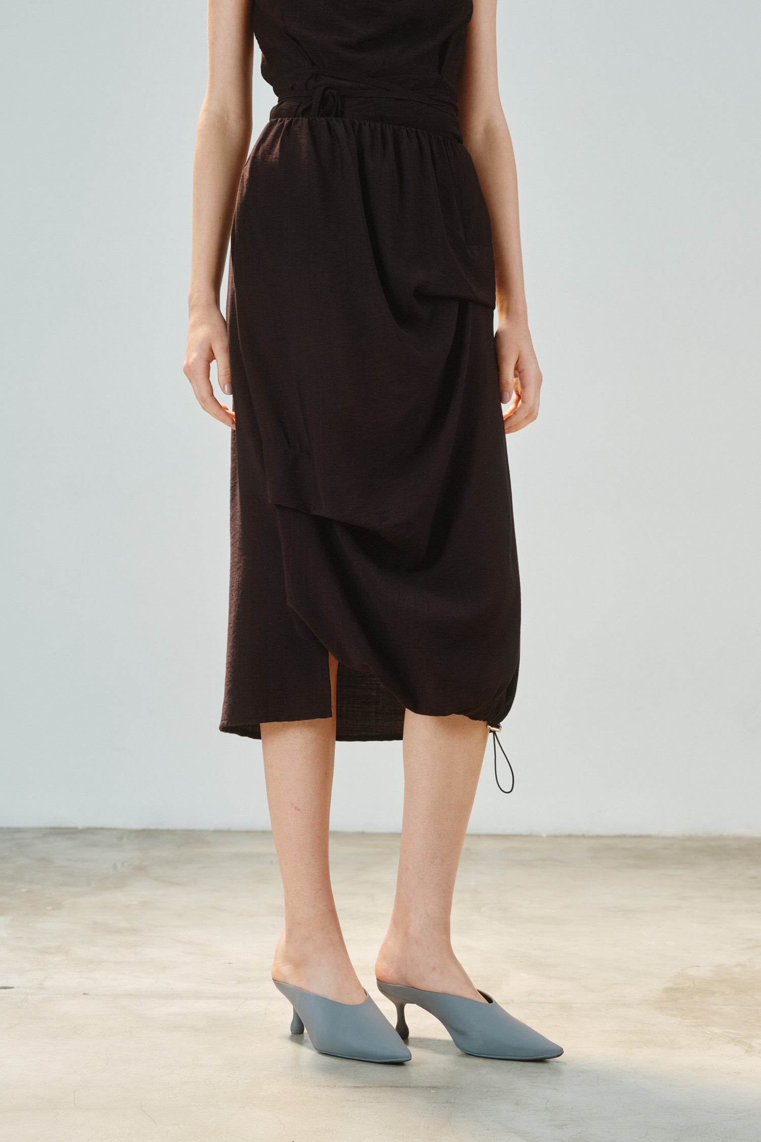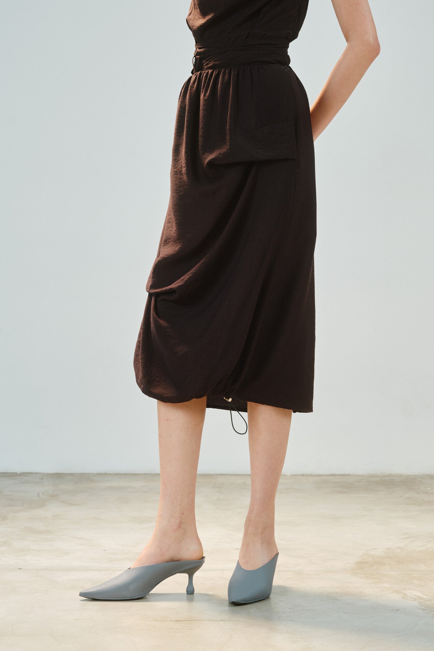 • Saia de comprimento longuete, com design que equilibra fluidez e estrutura.