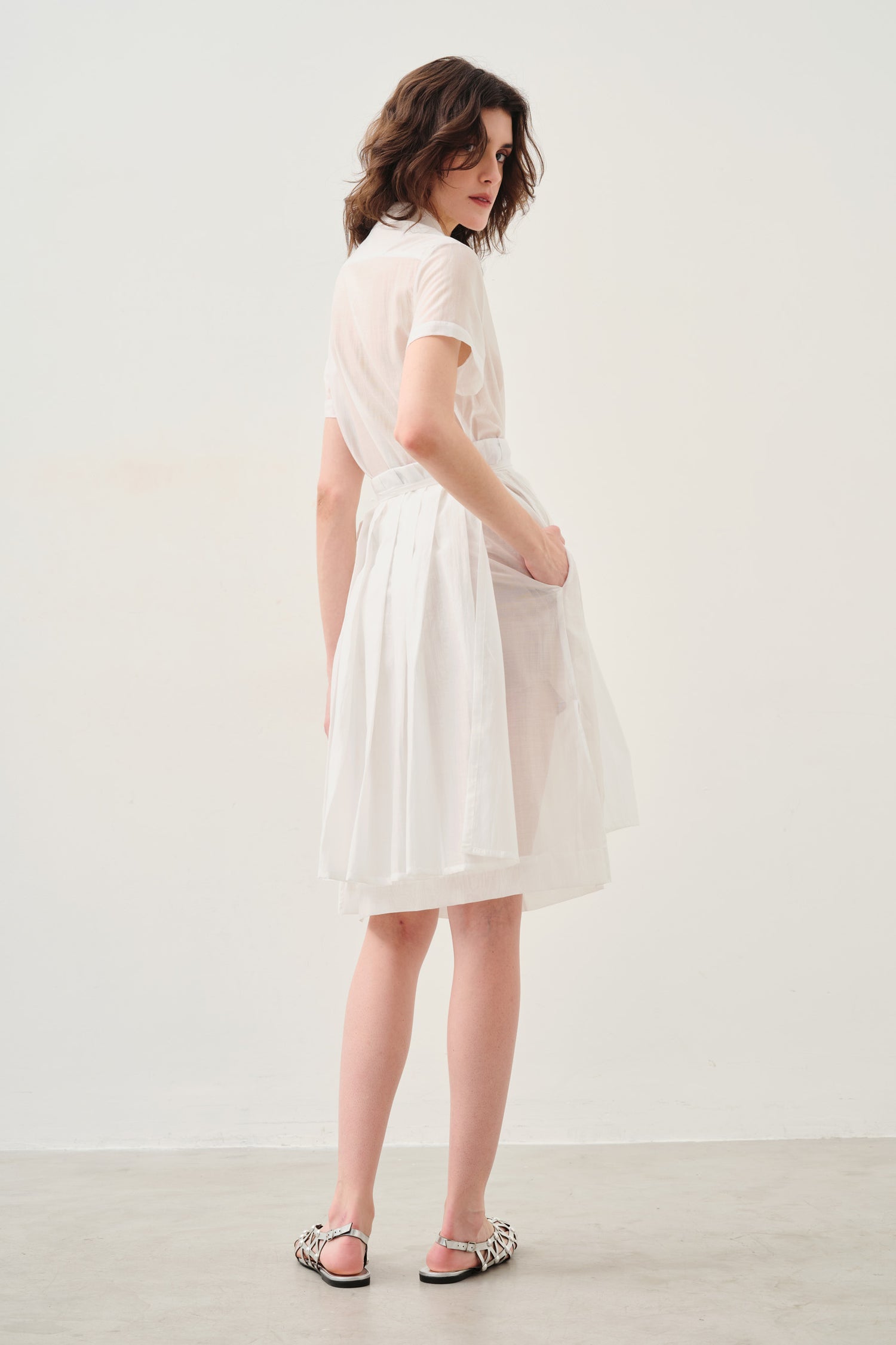 • Saia-cinto de amarração com construção plissada, pensada para sobrepor a peça principal, enriquecer volumes e reduzir a transparência