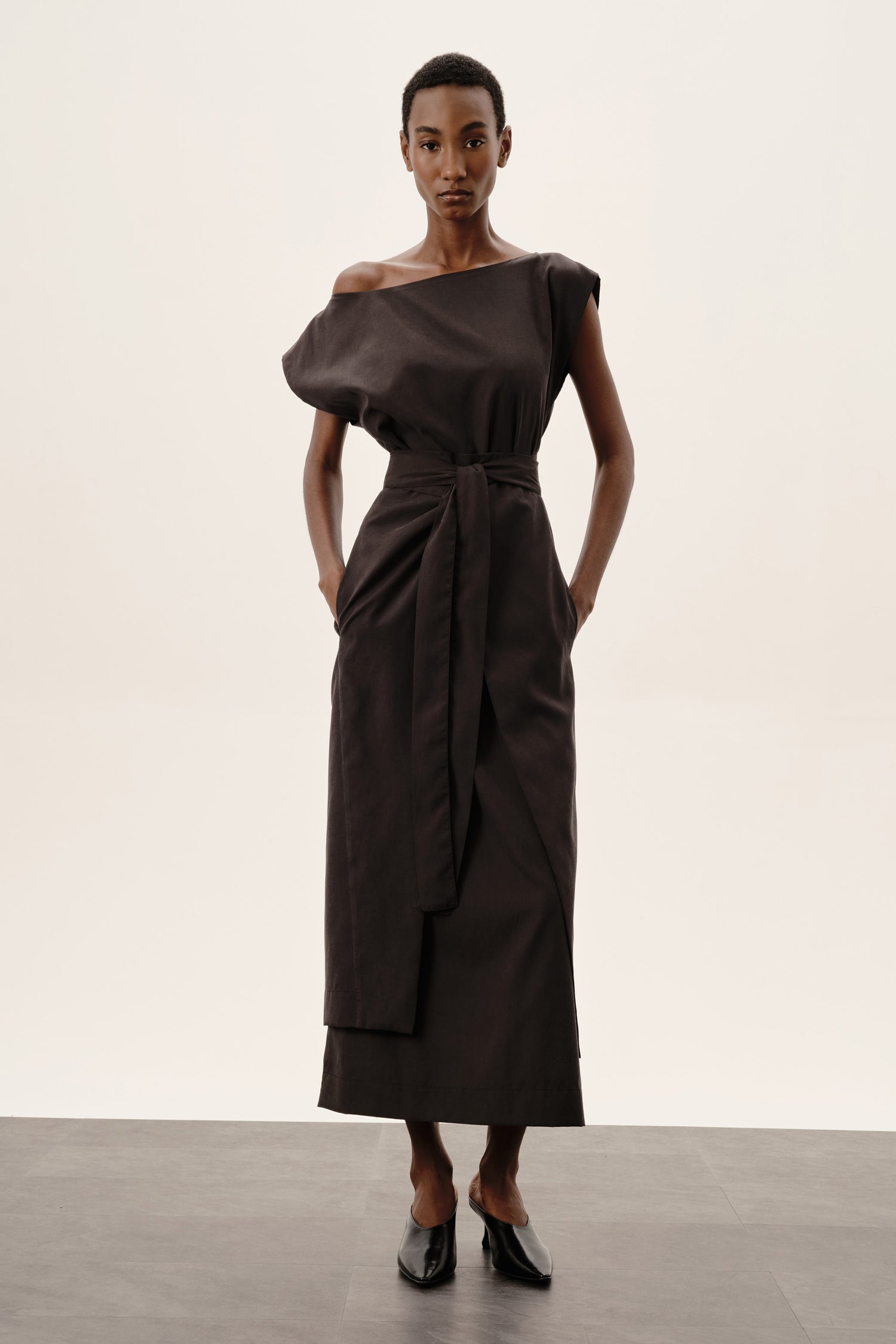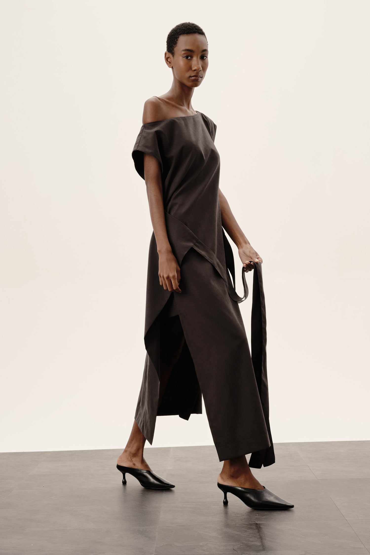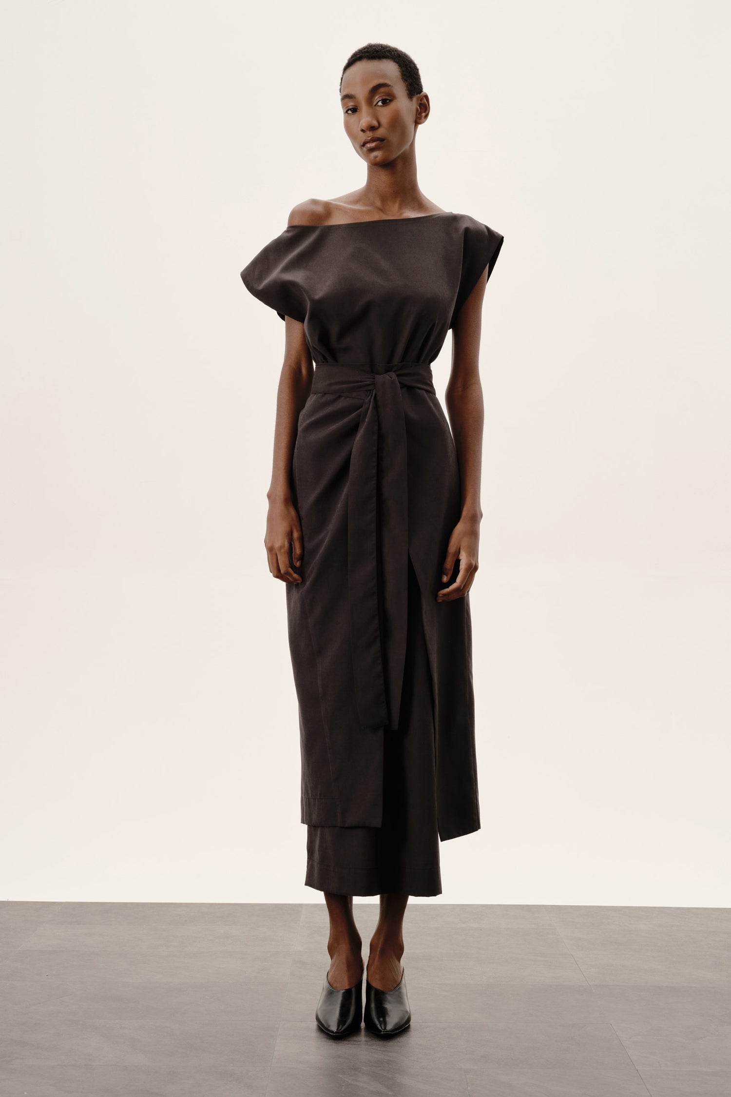 - Decote canoa que pode ser usado com os dois ombros à mostra ou de forma assimétrica, em apenas um ombro